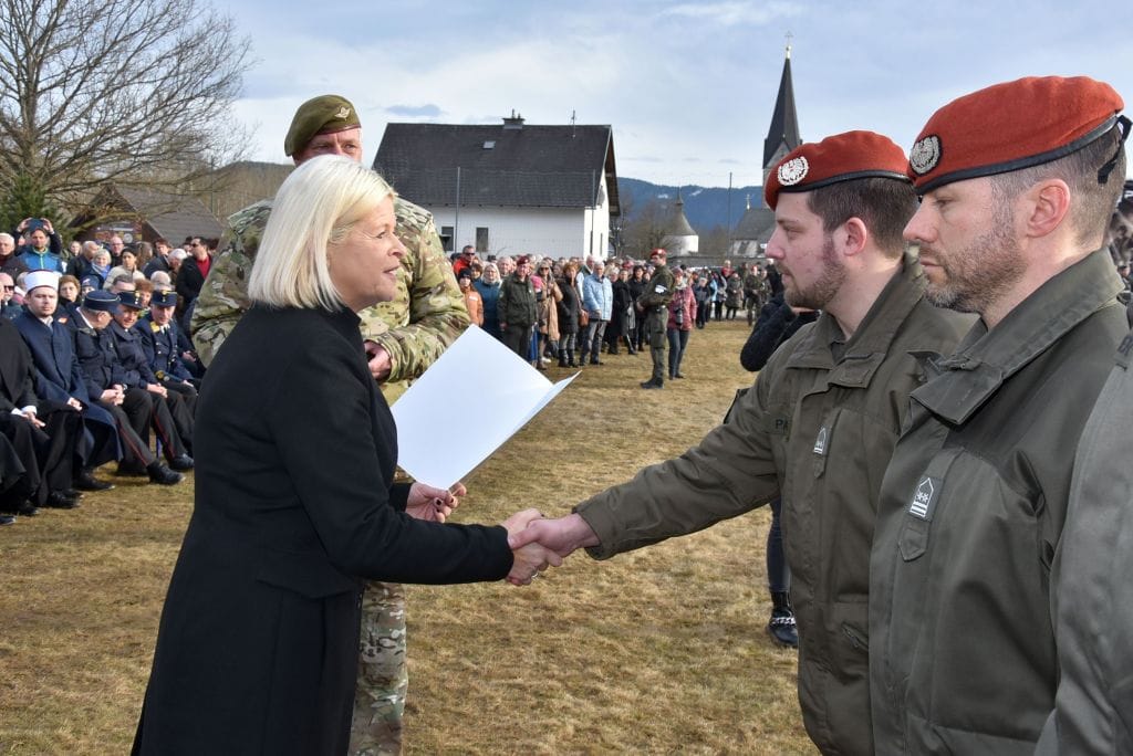 „Momente wie diese machen auch noch etwas anderes bewusst – und zwar, dass sich der Beruf der Soldatin, des Soldaten wohl von allen anderen unterscheidet. Weil er im schlimmsten Fall auch den Einsatz des eigenen Lebens bedeuten kann. Daher können wir am heutigen Tag nicht genug danke sagen für die Entscheidung, die unsere Rekruten getroffen haben„, so Ministerin Tanner abschließend.