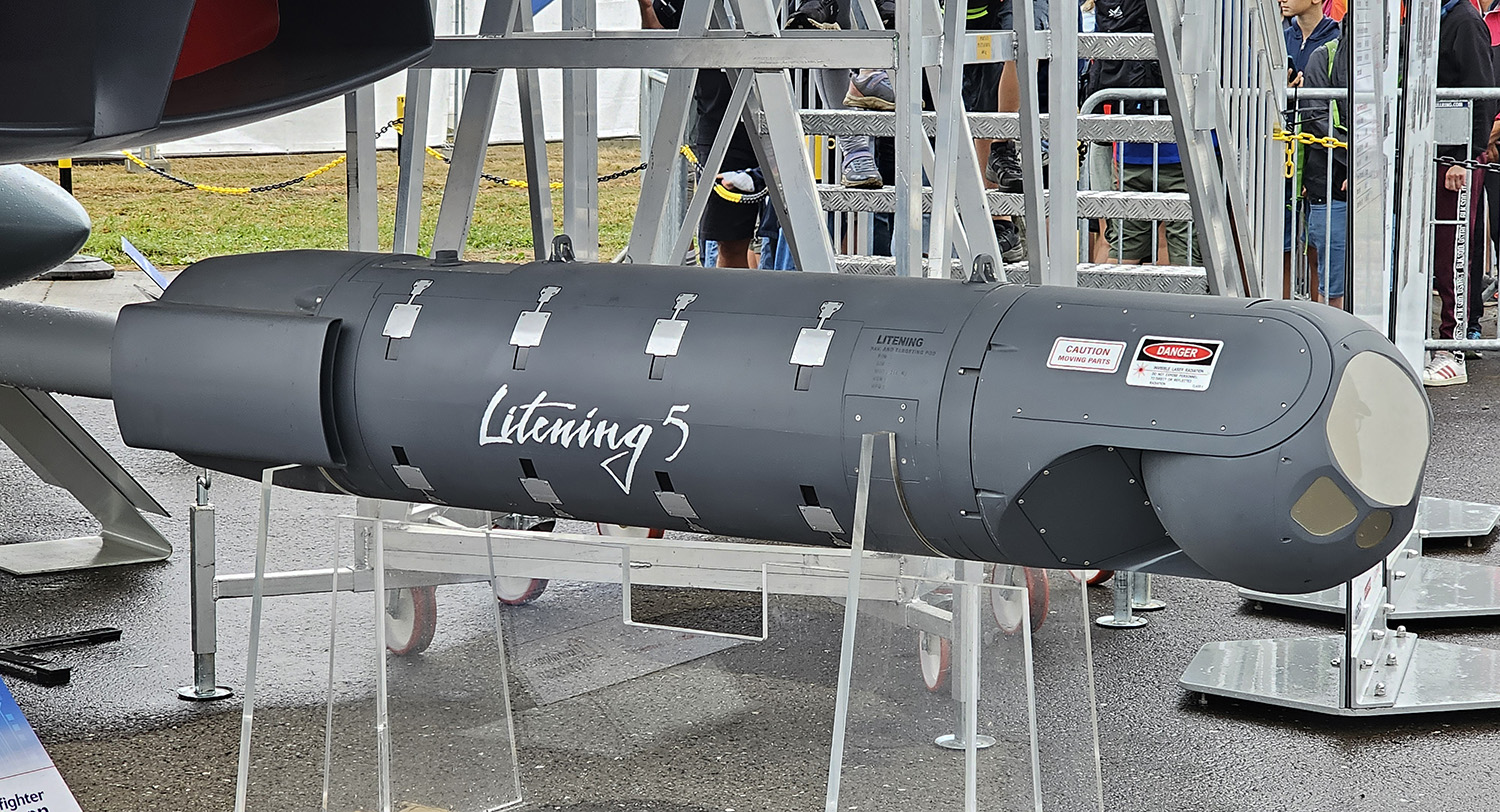 Der Litening V-Behälter des israelischen Unternehmens Rafael enthält elektrooptische und Infrarot-Kameras. Dieses hochmoderne System kann Luft- und Bodenziele bei Tag und Nacht über große Entfernungen automatisch verfolgen, deren exakte Position ermitteln und sie für Lenkwaffen markieren. Der Mehrwert für die Luftraumüberwachung liegt in der optischen Identifizierung eines Luftfahrzeugs aus mehreren Dutzend Kilometern Entfernung. Die Bilder können per Datenlink nahezu in Echtzeit an Dritte übermittelt werden – beispielsweise an die Einsatzzentrale für die Luftraumüberwachung in Salzburg.