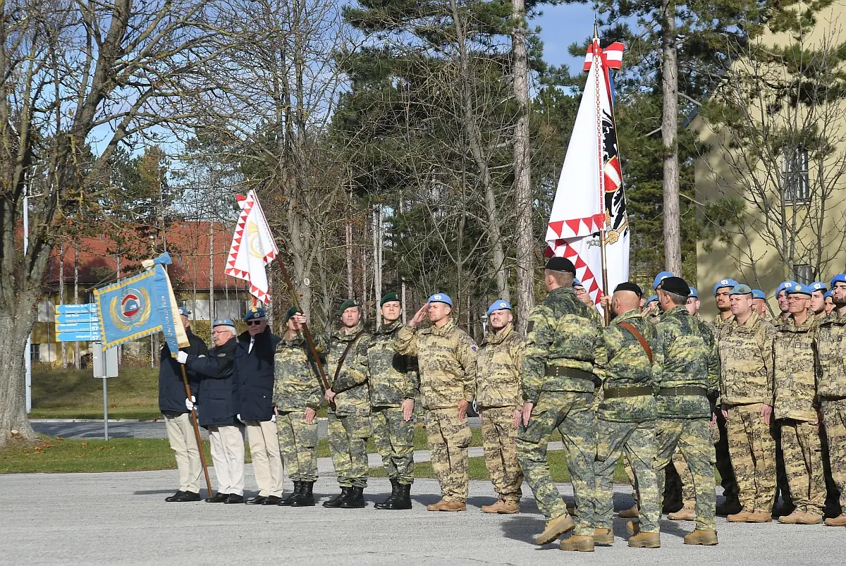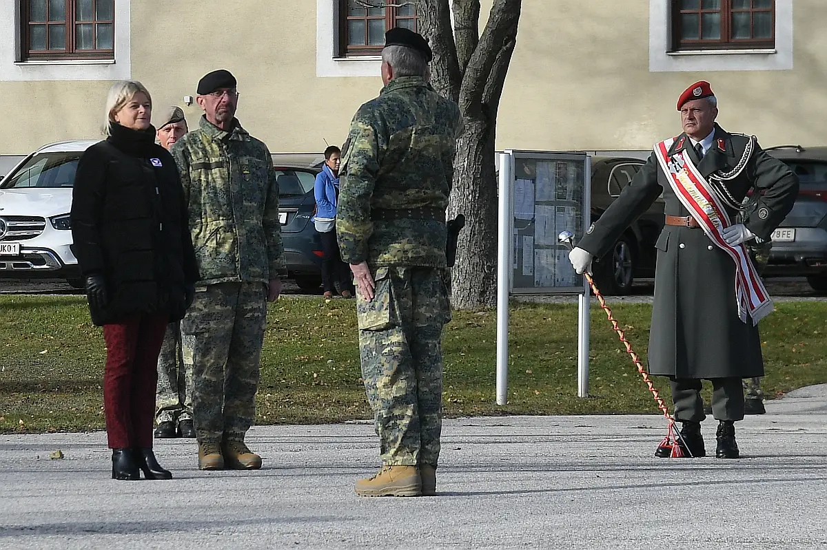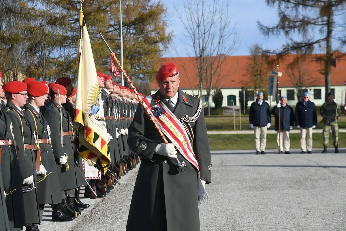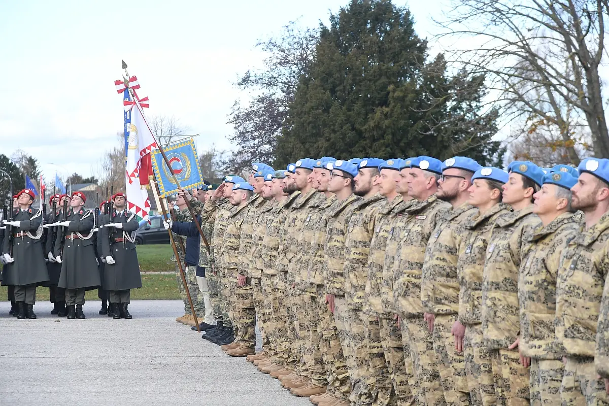 Oberst Wolf begrüßte außerdem Generalleutnant Martin Dorfer unter den Ehrengästen, seines Zeichens Kommandant der Land- und Spezialeinsatzkräfte, und würdigte Dorfer mit den Worten: „Wir sehen und spüren eine sehr klar gezeigte und umsichtige Führungskompetenz.” Ebenfalls anwesend war Generalmajor i.R. Nikolaus Egger, Präsident der Vereinigung Österreichischer Peacekeeper, die auch mit einer eigenen Standarte gleich neben dem zu verabschiedenden Kontingent angetreten waren. Ein Brückenschlag zwischen ehemaligen und aktiven österreichischen Blauhelm-Soldaten.
