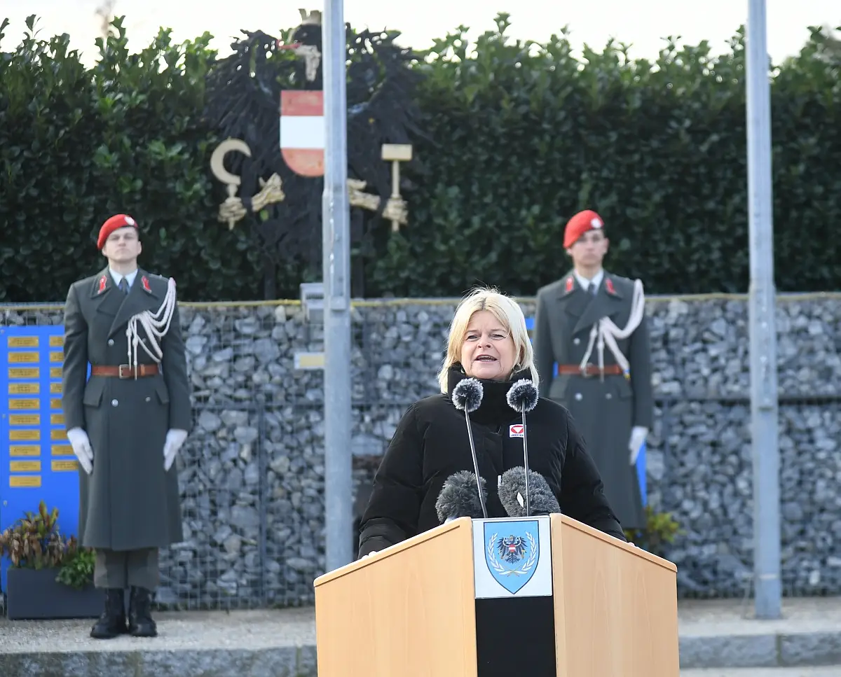 „Trotz angespannter Situation im Libanon leistet das Österreichische Bundesheer seinen Beitrag zur Friedenssicherung. Es freut mich besonders, dass an der Spitze dieses Kontingents erstmalig eine Frau die Agenden der Führung übernimmt. Dies zeigt, dass Frauen bei uns jede Aufgabe wahrnehmen und erfüllen können. Ich wünsche Frau Oberstleutnant Maria Eder und ihren Soldatinnen und Soldaten alles Gute für den herausfordernden Einsatz”, so Verteidigungsministerin Klaudia Tanner in ihrer Festansprache. Die Grade aus Wien umrahmte den Festakt musikalisch und stellte außerdem eine Ehrenformation.