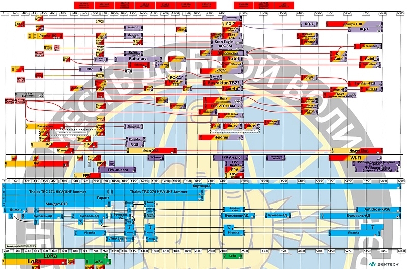 Das ist insofern bedeutsam, als weder russische Warngeräte noch Störsender auf diese Frequenzen abgestimmt sind. Wie weit außerhalb der bekannten Skala die Ukraine inzwischen operiert, zeigt ein Blick auf russische Frequenztabellen zum Drohneneinsatz – sie enden in allen bekannten Varianten bei 6,0 GHz (6.000 MHz).