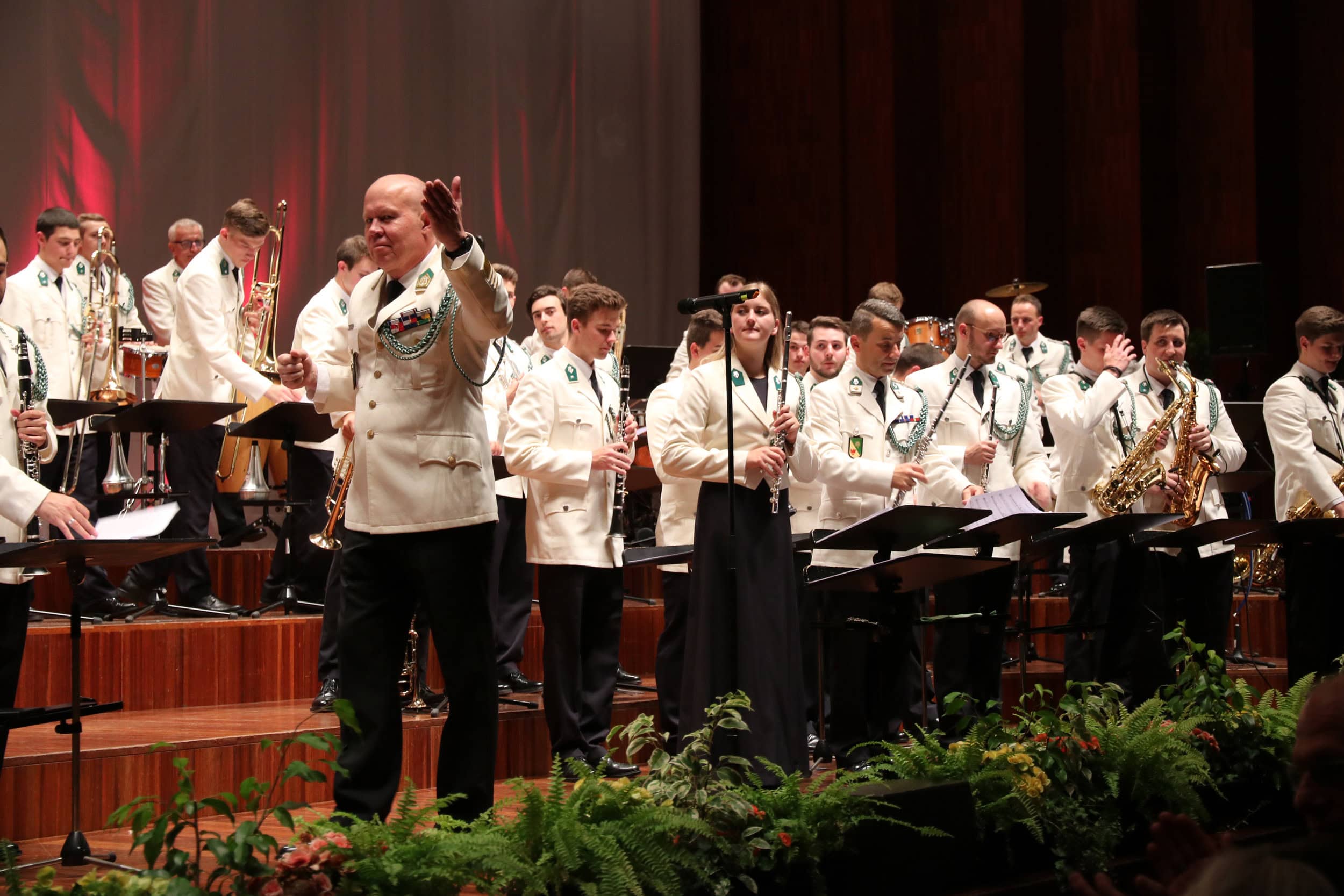 Colonel Apfolterer conducted his orchestra in the first part of the concert, from the “Fireworks Music”, a suite composed by Georg Friedrich Händel in 1748, to the “Danube Waves Waltz” composed by Josif Ivanovici, to the finale of the first part, the third movement from the completed suite “The Year of the Dragon” by Philip Sparke. An extremely demanding work that fully exploits the technical and tonal possibilities of a wind orchestra. A varied cross-section of the modern repertoire of the Militärmusik Tirol was performed in the second part of the concert. The soloists demonstrated their exceptional skills on a wide variety of instruments. The highlight of the evening was the vocal solos by the guest musicians, Lieutenant Colonel Dietmar Pranter, Military Bandmaster of the Military Music Carinthia and the well-known former military musician, retired Vice Lieutenant Klaus Schrott, who delighted the audience with hits such as “Can you feel the love tonight”, “Amor, Amor, Amor”, “Sweet Caroline” and “L’important c’est la rose”.