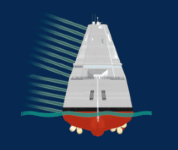 The absence of surfaces arranged at right angles to the water surface, few edges and hardly any protruding structures significantly reduces both the radar and infrared signature. This effect is further enhanced by the comparatively narrow “tumblehome hull”. On enemy radar screens, the destroyers should therefore appear like small, 15 to 20 meter long fishing boats that pose no threat.
