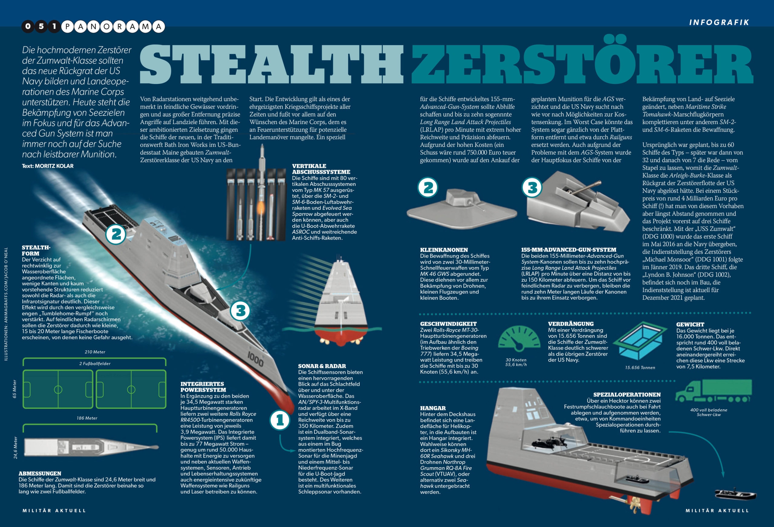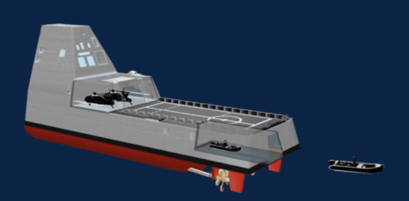 The two 155-millimetre Advanced Gun System cannons are designed to fire up to ten high-precision Long Range Land Attack Projectiles (LRLAP) per minute over a range of up to 150 kilometers. In order to conceal the ship from enemy radar, the approximately ten-meter-long barrels of the cannons remain hidden until they are deployed.