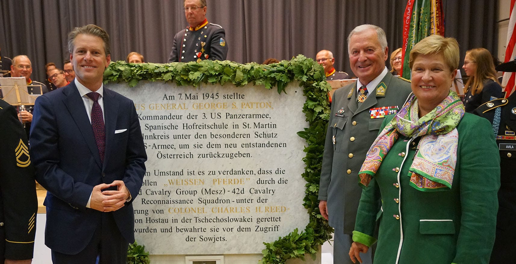 A memorial plaque in the castle of the municipality of St. Martin/Innkreis will commemorate the rescue of the Lipizzaner horses by the legendary US General George Patton and the soldiers of his 3rd American Army 76 years ago. “Without Elmar Rosenauer’s initiative, the matter would probably have grown over at some point and nobody would remember who we have to thank for the preservation of an important Austrian cultural asset,” emphasized retired Colonel Alexander Barthou, who played the “master of ceremonies” at the plaque unveiling ceremony a few days ago.