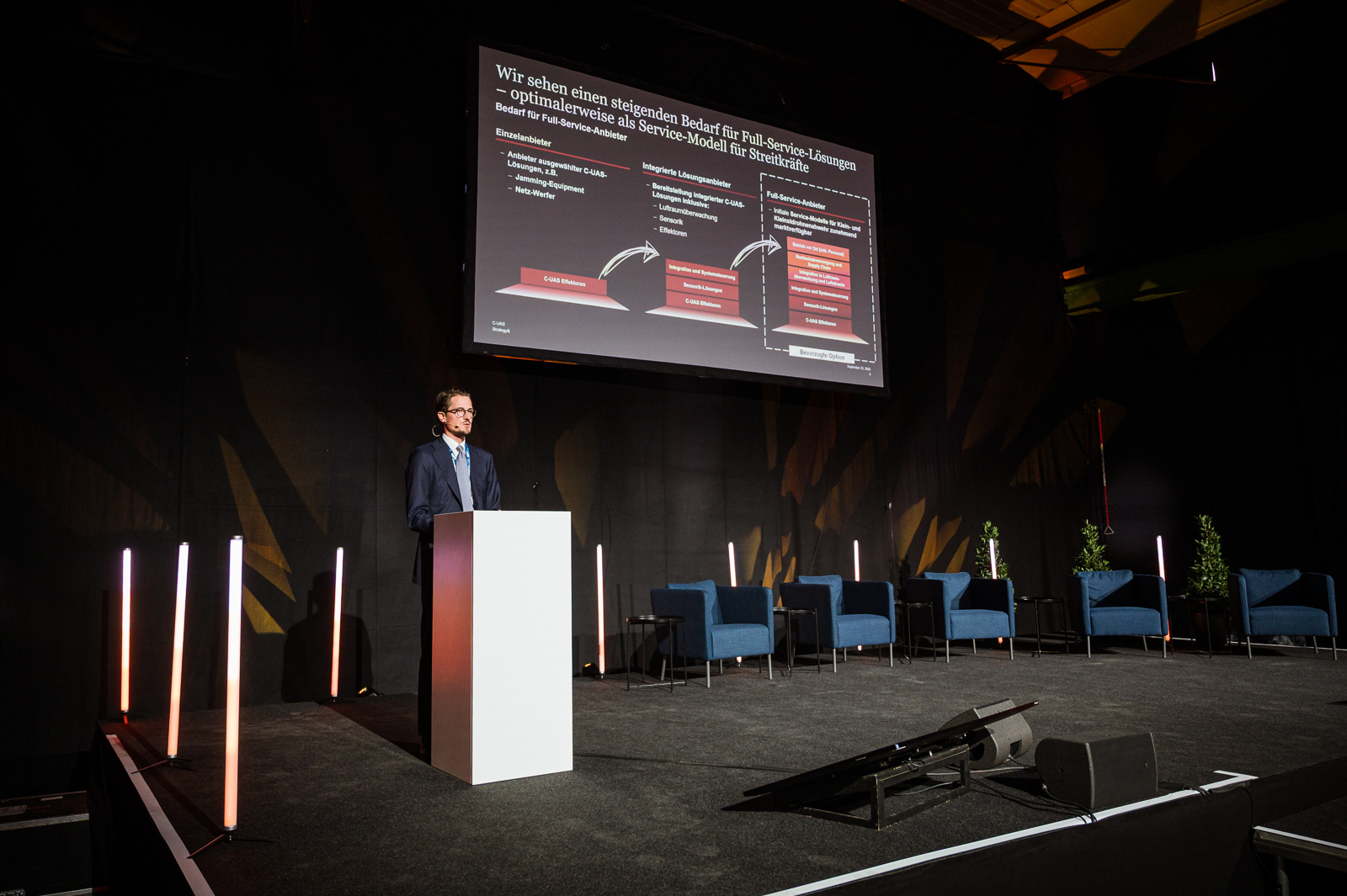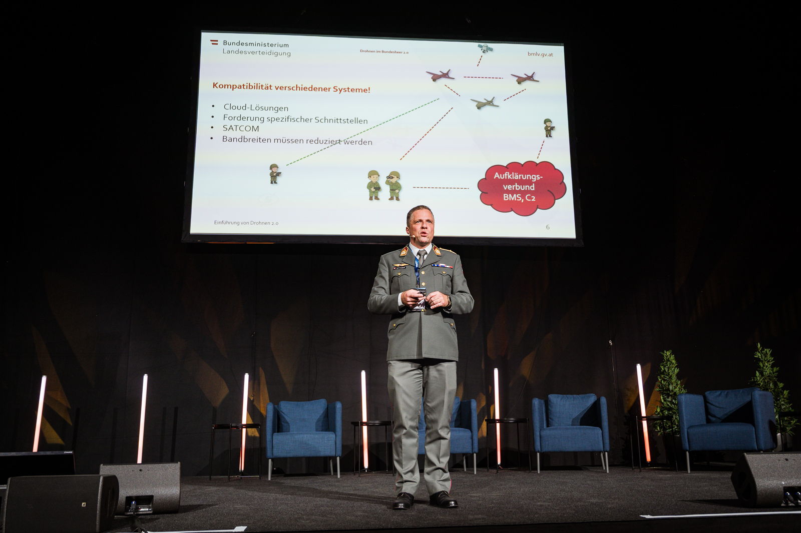 The coffee break was followed by a dense block of specialist presentations. Colonel Thomas Kettinger from the Austrian Armed Forces spoke about the introduction of “Drones 2.0”, Colonel Klaus Stutzmann from the German Armed Forces spoke about the further development of drone defense, Daniela Hildenbrand from Hensoldt presented the Elysion system, which has been tried and tested for years, and Thibault Karablin from Thales explained the precision of 70-millimeter missiles for UAVs, Susanne Winderl from IABG showed the current challenges of C-UAS systems, Fabian Ochsner from Halcon/Edge Group presented Sky Knight as an integrated protection solution and Nick Reiff from PwC concluded with the concept of “C-UAS as a Service”.
