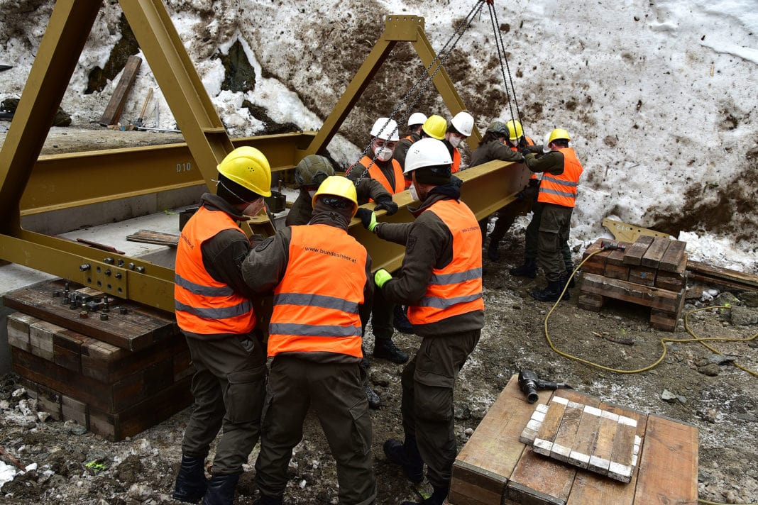 Around 40 pioneers from the Pioneer Construction Company in Salzburg began building a 9.15-metre-long temporary bridge near Matrei in East Tyrol this week. Back in December last year, an avalanche near Ganz tore down the only access bridge to high-lying farmhouses and a joinery. An avalanche cone formed in the area of the former bridge. The affected residents were still able to drive to their homes on this cone. In view of the rising temperatures, the municipality requested assistance from the Austrian Armed Forces.
