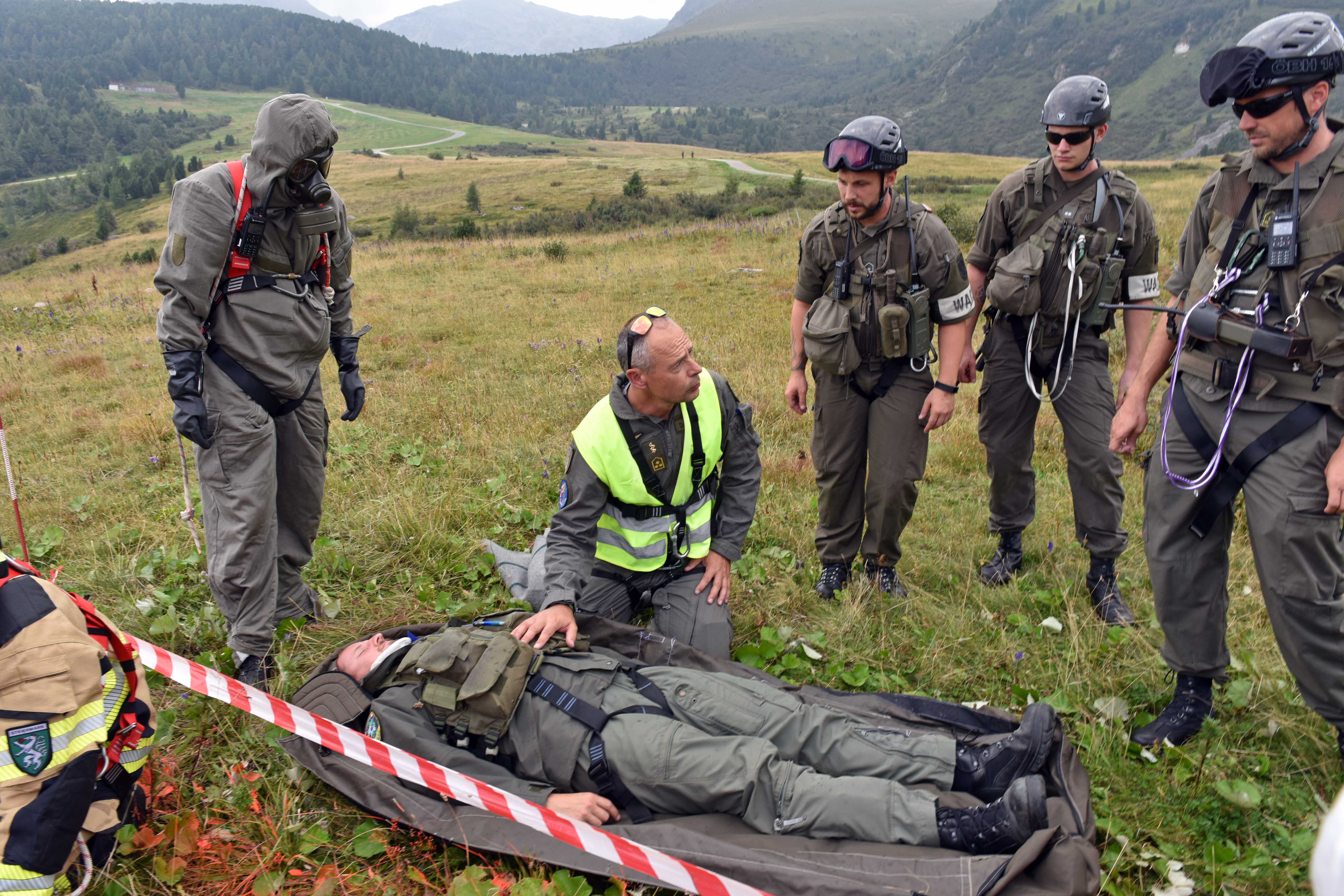 In the event of an emergency landing or a crash, the clear focus is on quickly finding and rescuing the casualties. The soldiers also have to extinguish a possible fire or secure the on-board weapons. Such missions require a mix of different specialists. The emergency team consists of a “crash crew” for rescuing the wounded and extinguishing fires, military police officers, NBC experts, a press and documentation team, guard soldiers and the commander of the team, Styrian Captain Reinhold Kern. Transport helicopters ensure rapid transportation to the scene of the accident, while an emergency doctor helicopter provides reconnaissance of the accident site and initial medical care. The helicopters are equipped with winches, enabling them to be used even in rough, mountainous terrain.