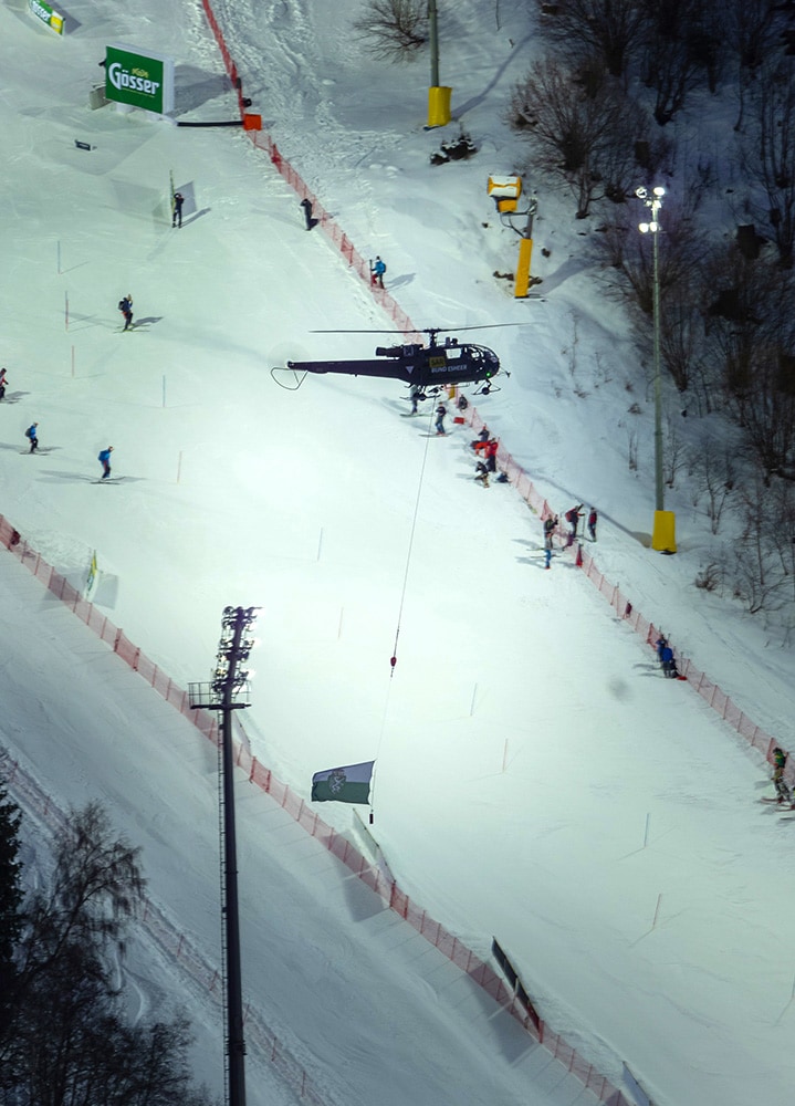 This September, the Austrian Armed Forces are organizing “Airpower 22” at the Hinterstoisser airbase in Zeltweg together with their partners, the Province of Styria and Red Bull. To promote the event, two Austrian Armed Forces Eurofighters flew an impressive performance demonstration yesterday evening before the start of the night slalom in Schladming. This performance was opened with a flag flight of an Alouette III with the Styrian flag.