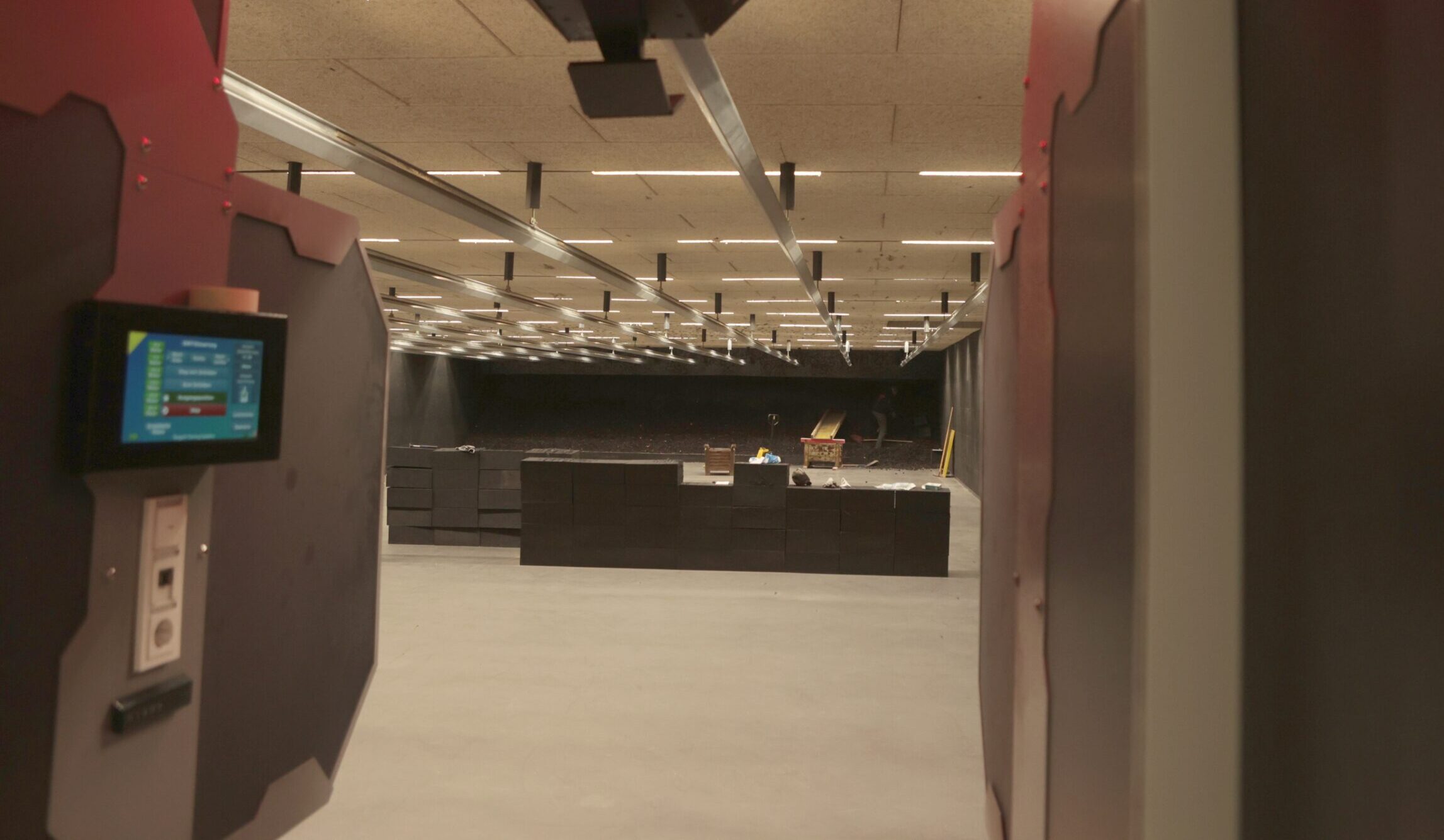 Next to it is the “Shoot House” with barricades and cars for dynamic courses. The integration of fitness training is also being considered. Strength and endurance units could be implemented into the shooting training here, according to the management during discussions. Furnished rooms for scenario training are also available. Finally, one hall further on, nine short and long rifle ranges with draw systems await static shooters.