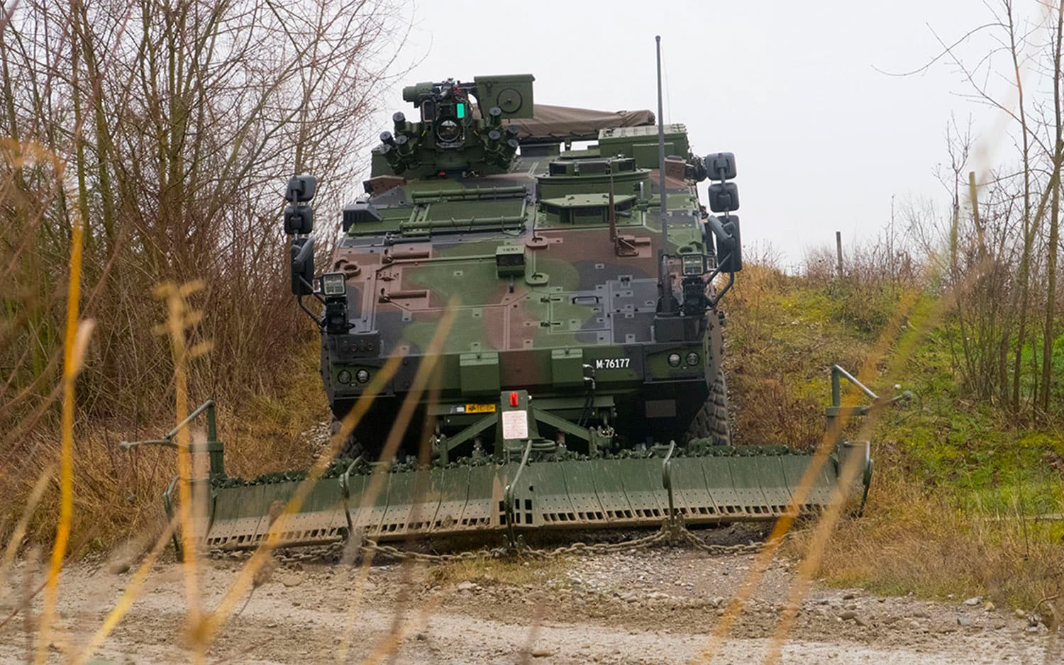 A pre-series vehicle is currently undergoing technical testing at armasuisse. Once the driving dynamics tests have been successfully completed, further tests on the hydraulic system and the attachments (grapple arm, mine clearance blade and dozer blade) will follow. Extensive load tests are also planned at the Bundeswehr’s vehicle proving ground in Trier (Germany).
