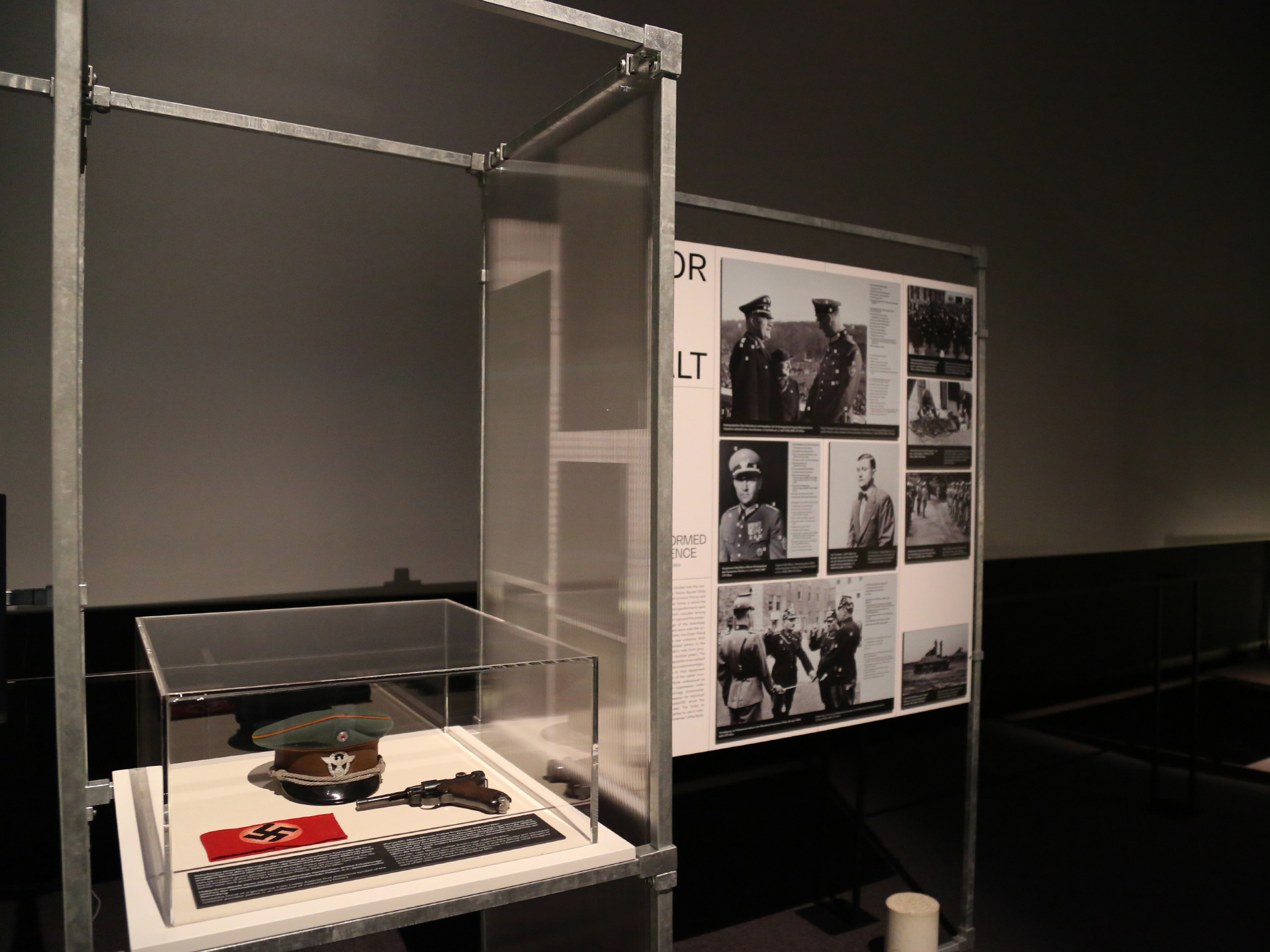 A photograph in the exhibition shows a training situation from this period. Men are standing in a circle, one trainee is lying on the ground. It is a drill that looks like a maneuver. A peaked cap with a Reich eagle badge, a swastika armband and a service pistol lie in a display case. Small objects that illustrate the extent to which symbolism and everyday life merged in those years. The exhibition does not work with overwhelming images, but with sober testimonies that speak for themselves.