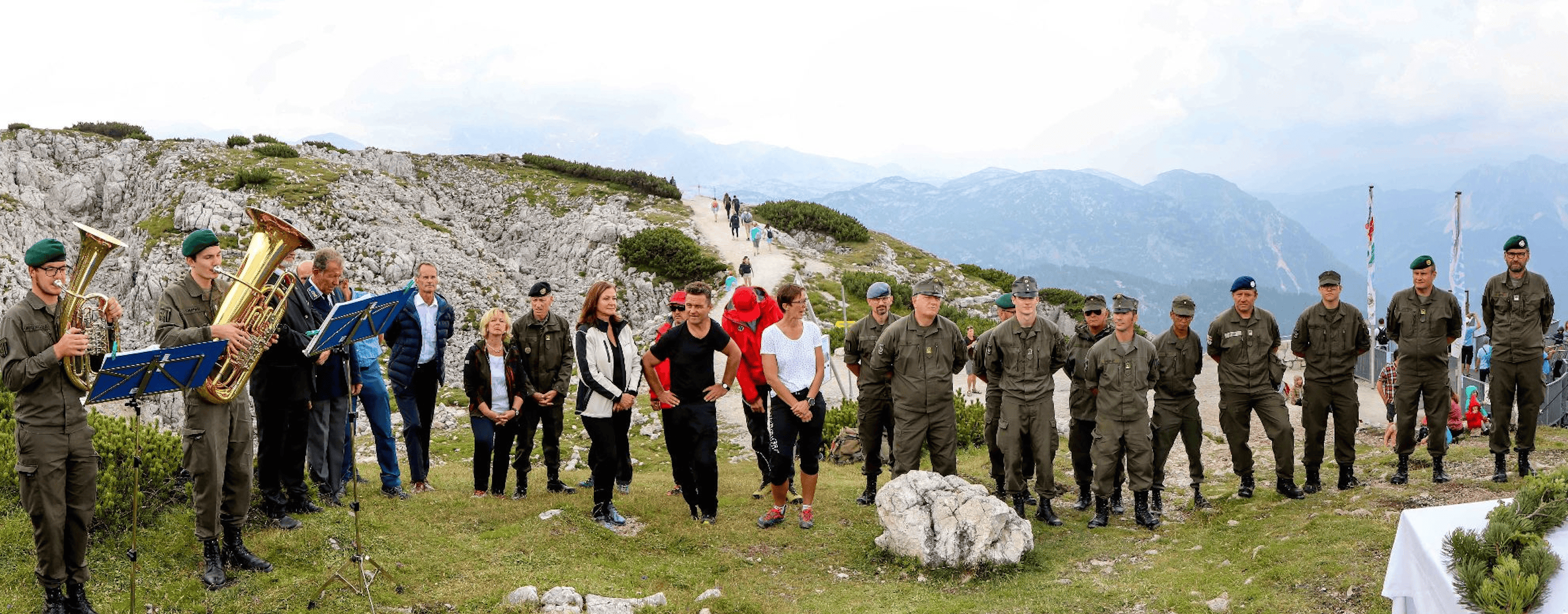 Accompanied by the sounds of a quartet of the military music of the Upper Austrian military command, the speeches of the mayor, the clergy and Colonel Daucher recalled the time of the construction of the military cable car to the Dachstein. Soldiers with pioneer training from the former Hiller barracks in Ebelsberg were tasked with building the cable car to the Oberfeld on the Dachstein. They were able to complete the work without any accidents. In gratitude, the soldiers erected the cross in their free time. The blessing of the military priests is intended to protect all hikers on the Dachstein/Krippenstein and visitors to the viewing platform from misfortune and harm. In front of many hikers and spectators, Mayor Höll also welcomed renowned guests of honor: the President of the Congress of Local and Regional Authorities in the Council of Europe, Gudrun Mosler-Törnström, the Member of Parliament for Upper Austria, Sabine Promberger, the District Governor of the Gmunden district, Mag. Alois Lanz and well-known representatives of the Dachstein cable car company, as well as the commander of Pioneer Battalion 2, Colonel Günter Gann and a delegation from the Upper Austrian military command led by Colonel Ludwig Daucher. Representatives of the mountain and water rescue services and the Upper Austrian Comradeship Association also attended the ceremony.