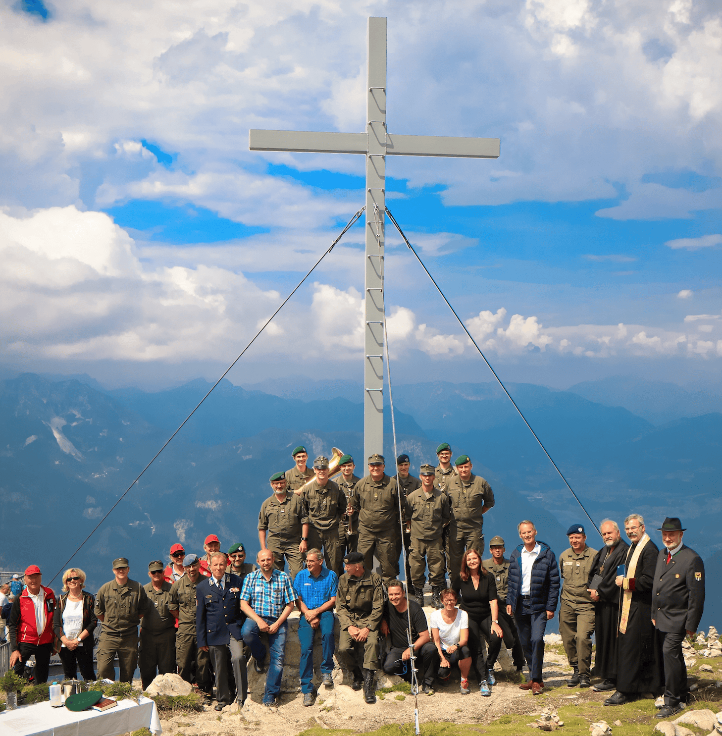The mayor of the municipality of Obertraun, Egon Höll, initiated the renovation last year at the Federal Ministry of Defense. Pioneers from Salzburg Pioneer Battalion 2 painstakingly restored the cross on the Krippenstein. The foundation was renovated and supplemented with new stones, the guy ropes were renewed and the cross was given a new protective coat of paint. The cross was consecrated by military chaplains of the Austrian Armed Forces at a small ceremony on August 2nd.