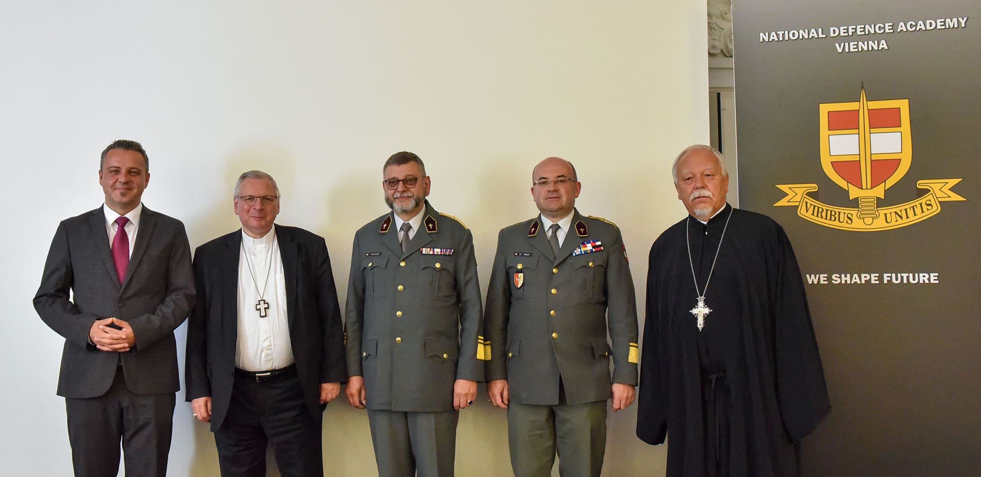 The religious representatives from Bosnia and Herzegovina, Serbia, Germany and Austria were warmly welcomed with a video message from Defense Minister Klaudia Tanner. The senior religious representatives present, the Catholic military bishop Werner Freistetter (-> Interview with the military bishop from the soldiers’ pilgrimage in Lourdes), military superintendent Karl-Reinhard Trauner, the representative of the Orthodox military chaplaincy Father Alexander Lapin and the president of the Islamic religious community, Ümit Vural, together with Lieutenant General Erich Csitkovits, welcomed the international representatives in the Sala Terrena of the National Defense Academy. In their speeches, they emphasized the importance of an open and respectful exchange among each other.