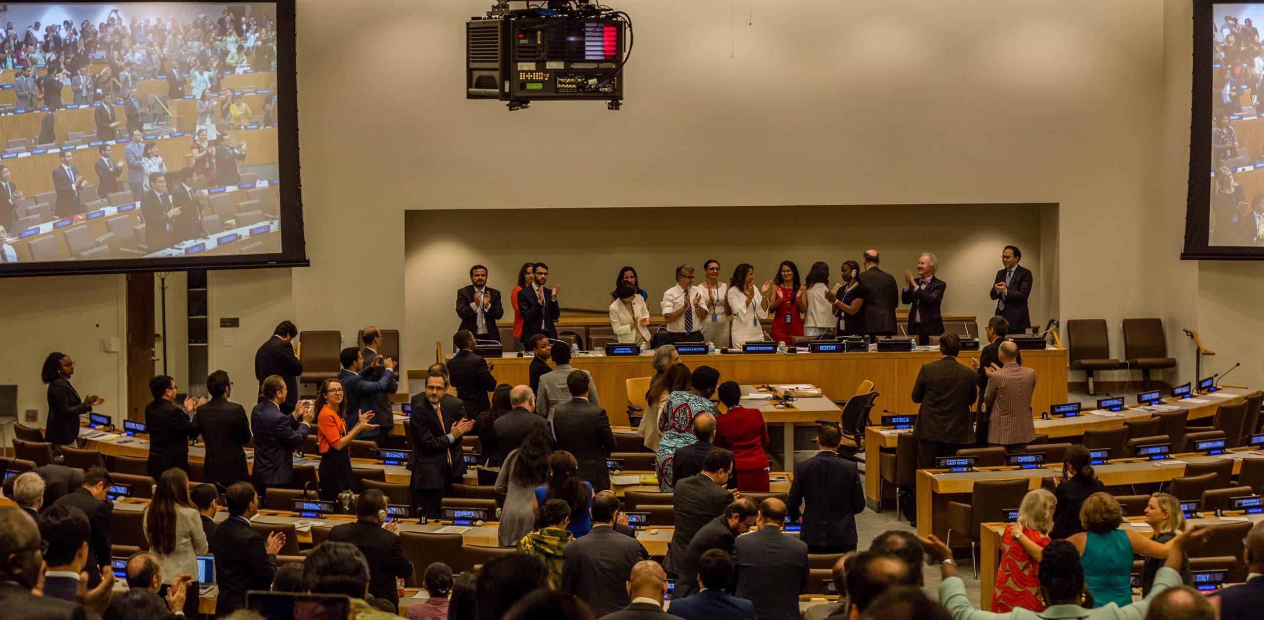 Although they were invited to the negotiations, the nuclear weapon states and those countries under their “nuclear umbrella”, with the exception of the Netherlands, did not take part in the negotiations. Ambassadors from nuclear weapon states and some of their allies even held a protest outside the General Assembly Hall at the start of the negotiations, during which US Ambassador Nick Haley declared that as a mother she could not be in favor of a nuclear weapons ban. This boycott of the negotiations contradicted the annual US statements that a legal prohibition norm is necessary to achieve a nuclear weapons-free world. By staying away, the nuclear-weapon states accelerated the progress of negotiations, as all negotiating parties now had an interest in constructive and results-oriented negotiations and in achieving a good treaty text. On July 7, 2017, the treaty text was adopted by 122 states, with the Netherlands voting against and Singapore abstaining.