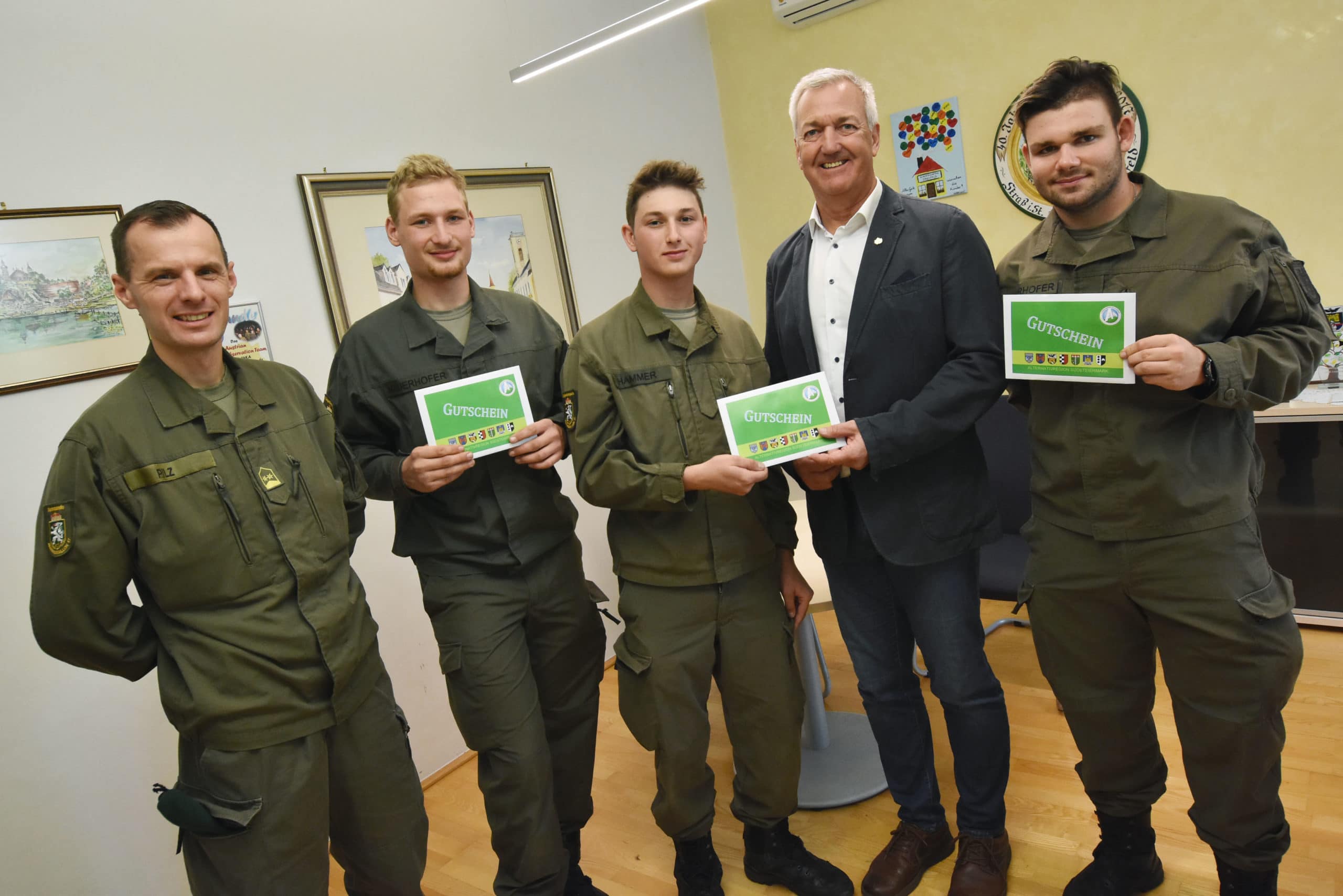 Barracks commander Lieutenant Colonel Georg Pilz and garrison mayor Reinhold Höflechner thanked the three recruits for their civil courage with a small gift.