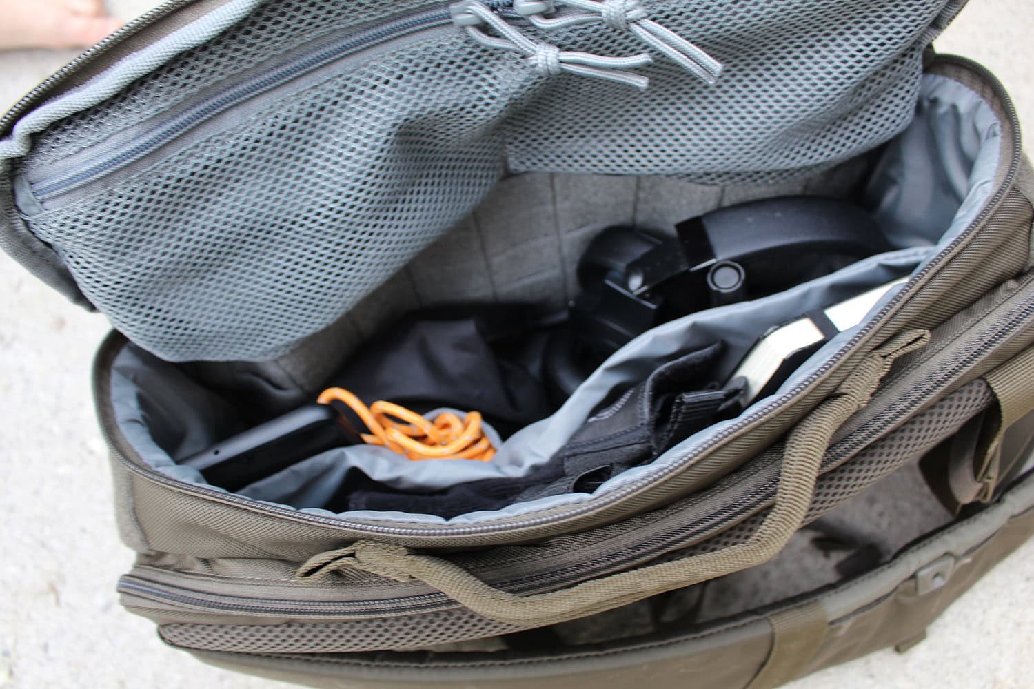 The main compartment is divided into a padded compartment for a tablet or a small notebook (unfortunately there is no room for laptops from 15 inches) and a larger area for the rest of the equipment. Slots for small items such as pens and knives ensure that nothing gets mixed up, while compression straps on three sides ensure that the bag can be securely fastened even with little content. All in all, the LV10 has no major weaknesses, but many strengths, making it a practical companion for everyday life and outdoor adventures.