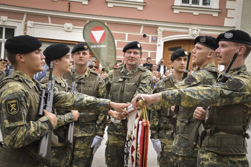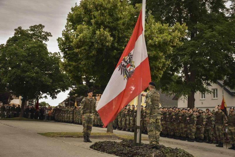 On July 10, around 150 soldiers joined Reconnaissance and Artillery Battalion 4 to complete their basic military service. Over the coming months, they will be trained by the battalion as reconnaissance, artillery, command support and supply personnel. The ceremonial swearing-in for this enlistment and for recruits from the Langenlebarn Air Force and Anti-Aircraft Troop School recently took place on the main square in the market town of Vitis.