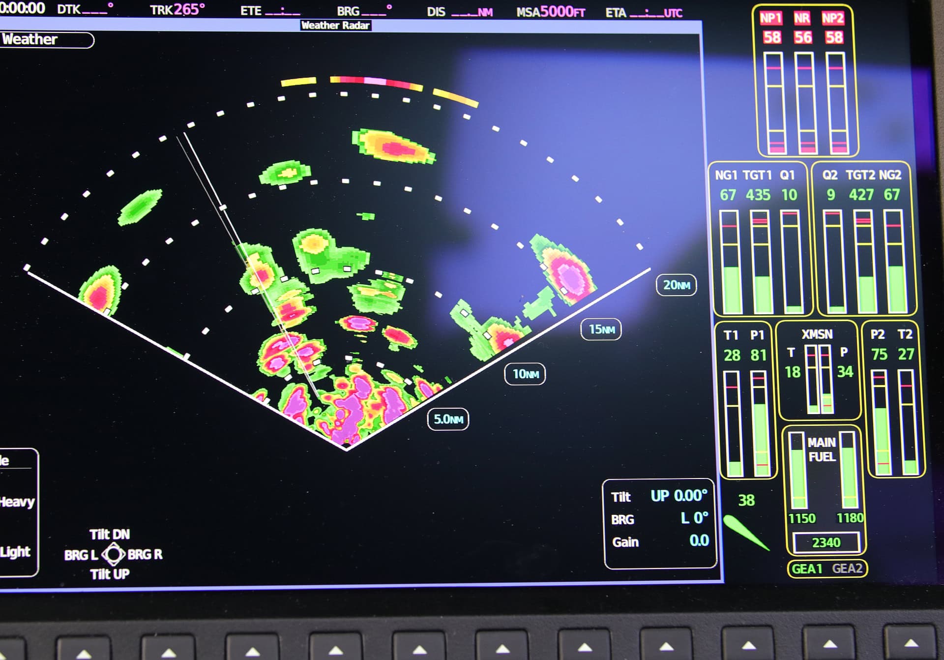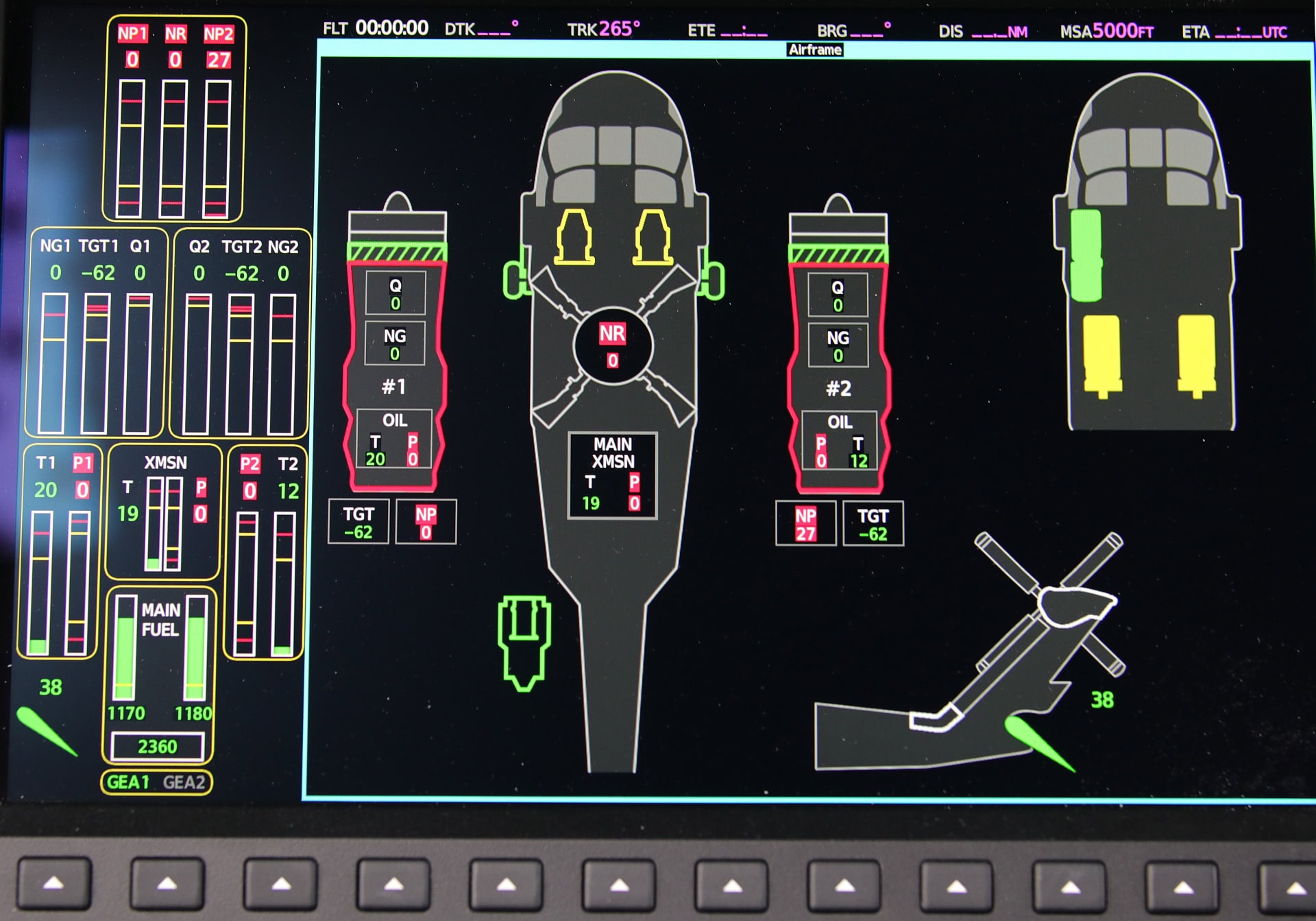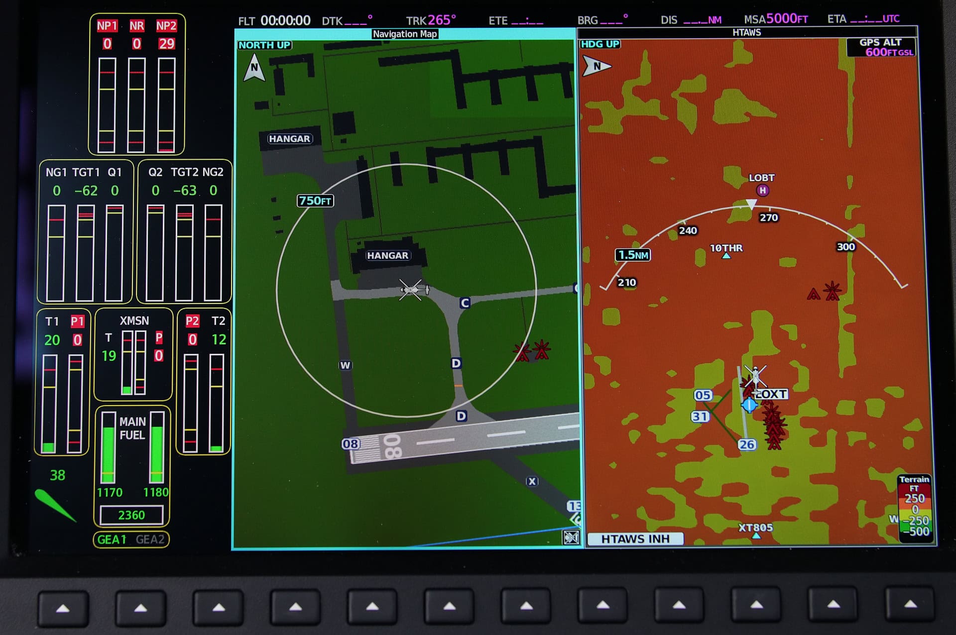 Am Instrumentenboard außen sind die Primary Flight Displays, innen die MFD-Displays. Wobei z.B.