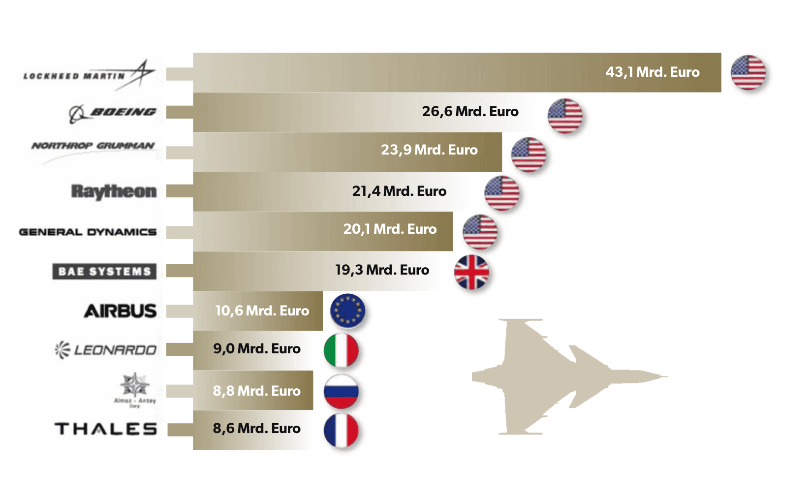 According to a recently published factsheet by the Swedish peace research institute SIPRI, the global arms business is firmly in the hands of US companies. According to the report, around 59 percent of all global investments in weapons and military services are made by companies from the United States, with 43 of the 100 largest companies in the industry based between Washington and Los Angeles. The Russian and British arms industries (with a global market share of 8.6 and 8.4 percent respectively) are far behind. Companies from France, Italy, Germany, Japan, Israel and the rest of Europe only play a subordinate role in the turnover ranking. However, with BAE Systems, Airbus, Leonardo and Thales, at least four European groups have made it into the top 10 companies with the highest turnover in the industry. Leading the way are five US companies, Lockheed Martin (see chart below), Boeing, Northrop Grumman, Raytheon and General Dynamics.