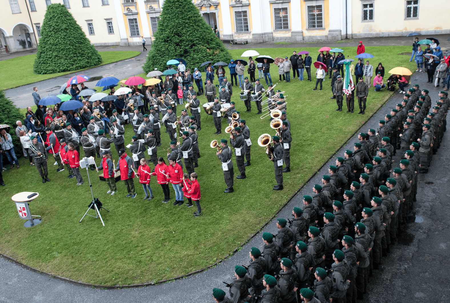 Um Punkt 18.00 Uhr begann am 25. Mai im prachtvollen Stiftshof des Augustiner-Chorherrenstiftes Sankt Florian die feierliche Angelobung von rund 130 Grundwehrdienern des Militärkommandos Oberösterreich. Die Soldaten sind am 2. Mai am Fliegerhorst Vogler in Hörsching eingerückt und absolvieren zurzeit ihre Basisausbildung, bevor sie in ihre Funktionen als Wachsoldaten, Kraftfahrer und Baupioniere eingeteilt werden.