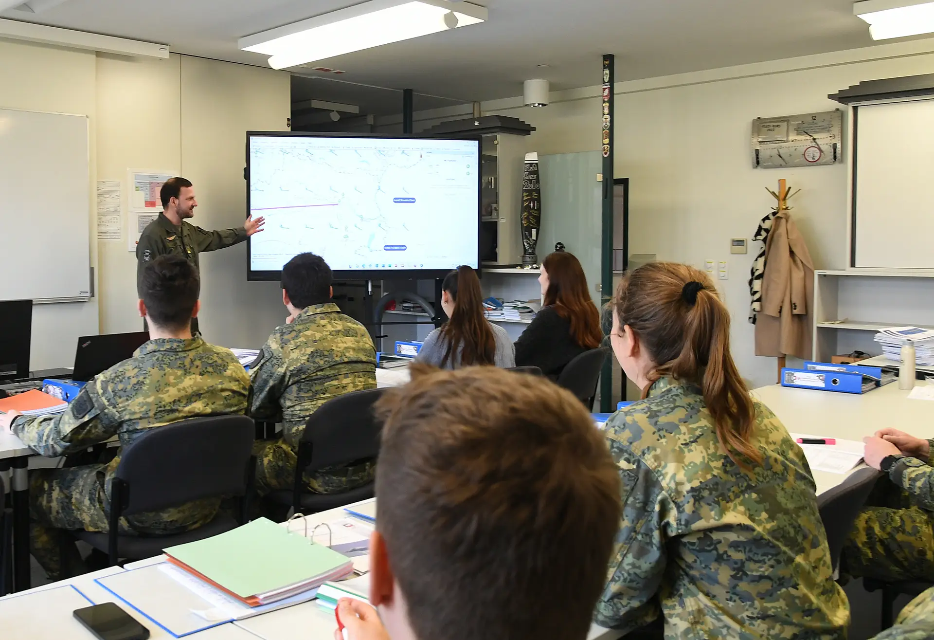 Zu den theoretischen Kenntnissen, welche die angehenden Fluglotsen sich aneignen müssen, gehören unter anderem nationales und internationales Luftfahrtrecht, Navigation, Flugplanung, Luftfahrtenglisch, Meteorologie, aber auch die Leistungsdaten verschiedener militärischer und ziviler Flugzeugmuster, um ein besseres Verständnis dafür zu bekommen, welche Anweisungen ein Pilot überhaupt umsetzen kann.