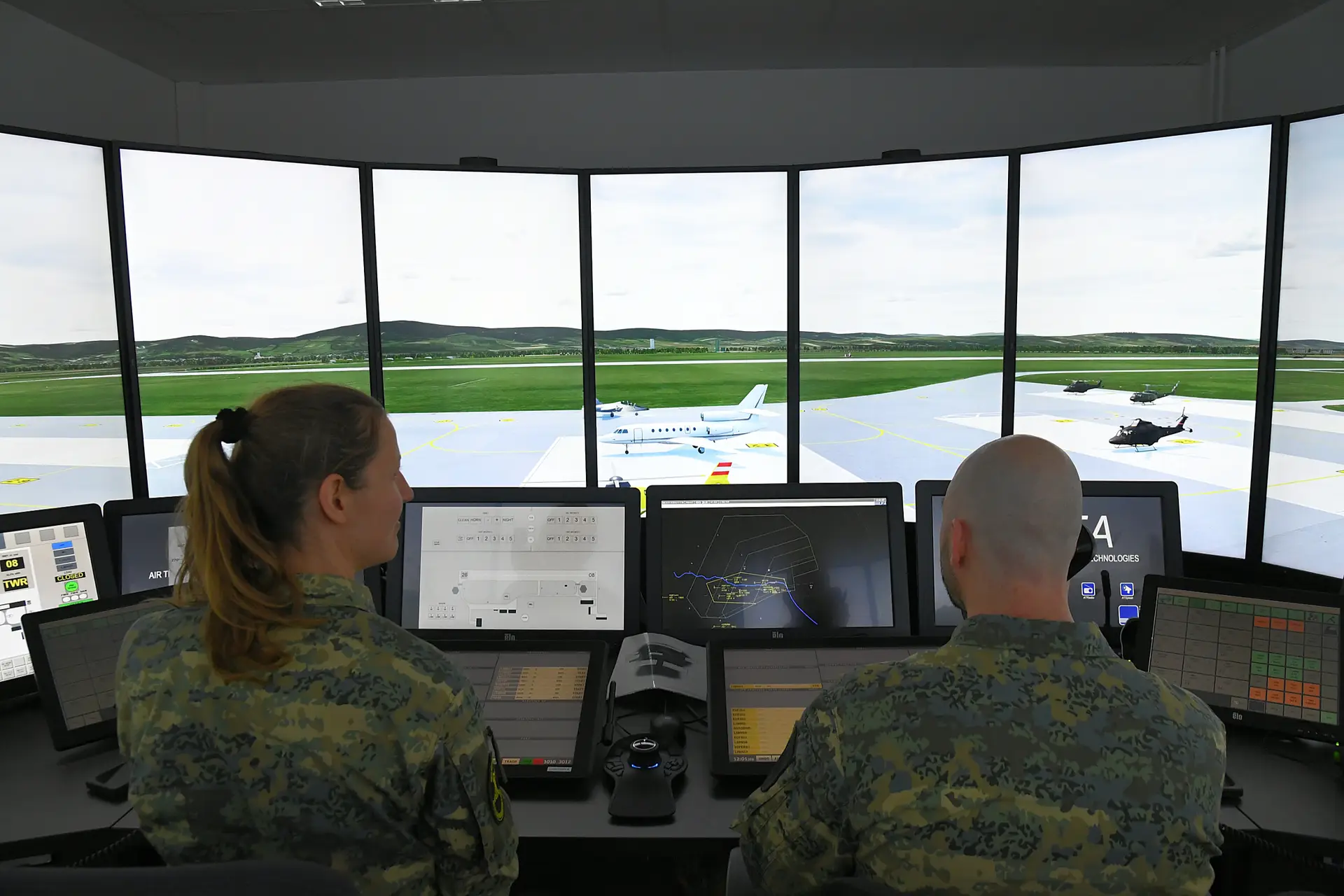 Danach geht es zurück nach Österreich, wo an den jeweiligen Ziel-Arbeitsplätzen weitere Kenntnisse in Praxis und Theorie im sogenannten „On the Job Training” im realen Flugbetrieb unter Aufsicht eines Instruktors vermittelt werden. Parallel dazu steht für das Lotsentraining auch ein hochmoderner Tower-Simulator an der Flieger- und Fliegerabwehrtruppenschule in Langenlebarn zur Verfügung. „Noch vor ein paar Jahrzehnten stand man bei der „Simulator-Ausbildung” einfach um einen Tisch mit Flugplatz-Layout und ein Instruktor bewegte Flugzeugmodelle händisch oder mit Seilzügen. Heute können wir mit dem modernen Sicht- und Sprechfunksystem im Tower-Simulator sämtliche Szenarien aller österreichischen Militärflugplätze annähernd zu hundert Prozent realitätsnah nachstellen. Sowohl die Luftfahrzeuge, insgesamt mehr als 180 militärische wie zivile, aber auch die Darstellung der Umgebung, Wetterphänomene, Nebel, Rauch und so weiter sind kaum von der Realität zu unterscheiden. Das ist ein enormer Fortschritt in der Qualität der Ausbildung”, unterstreicht Oberst Janoschek stolz.