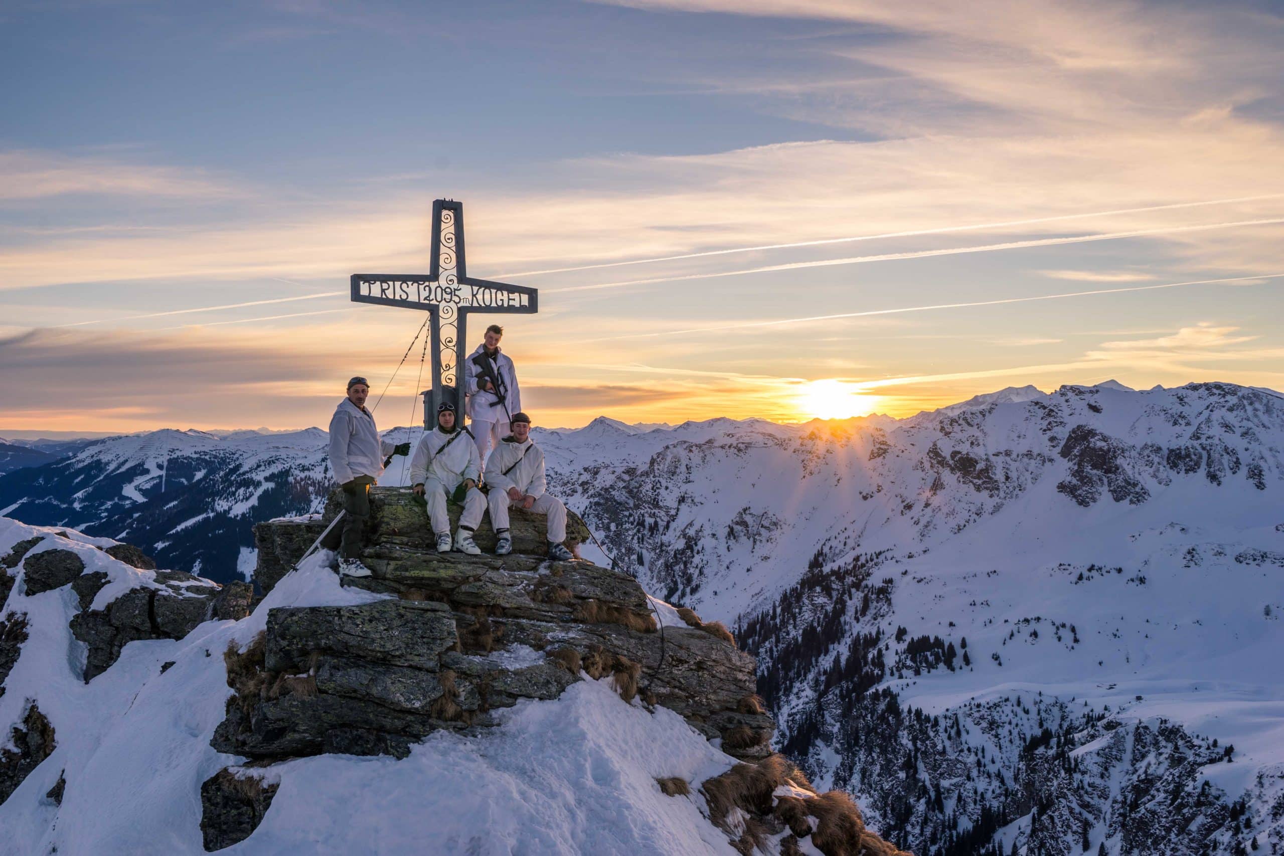 Diese Soldaten der 2. Kompanie des Jägerbataillons 24 aus St. Johann in Tirol dürfen sich glücklich schätzen: Nach einer Nacht im Biwak in den Kitzbüheler Alpen sind sie Anfang Jänner im Ramen der spezialisierten Truppengebirgsausbildung auf den Gipfel des 2.095 Meter hohen Tristkogels aufgestiegen. Während unten im Tal Bergsteiger noch ihr Frühstück genießen und ihre Ausrüstung packen, können die Soldaten von hoch oben bereits den atemberaubenden Sonnenaufgang genießen.
