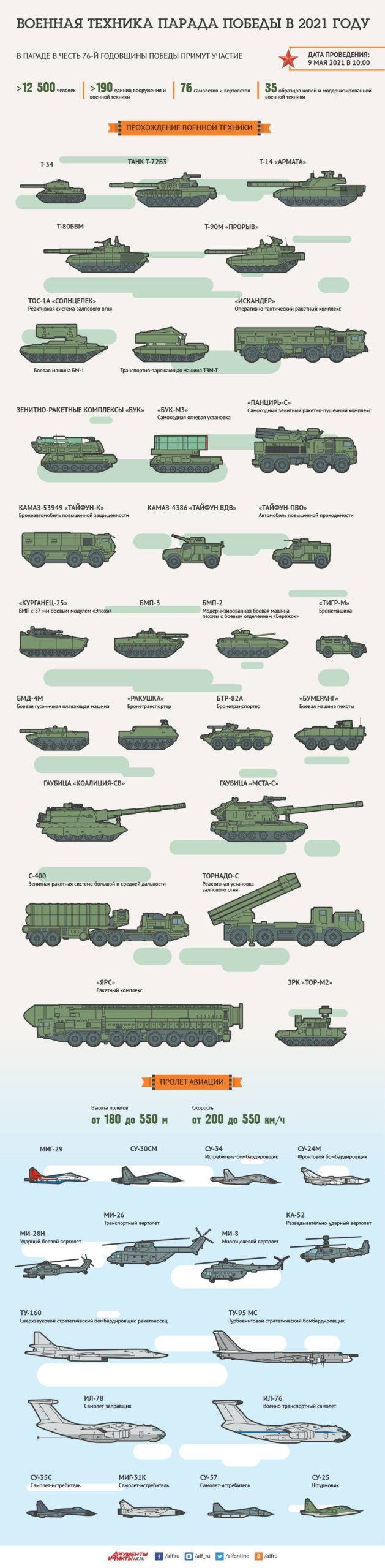 Am – ürigens diesmal nicht mit Silberjodid „freigeimpftem” und teils sogar regnerischem – Himmel über Moskau nahmen diesmal 76 Geräte teil, exakt so viele wie Jahre seit dem Tag der deutschen Kapitulation. Die Vorbeiflüge wurden – teils knapp entlang der Wolkenuntergrenze – in Höhen von 180 bis 550 Metern und mit Geschwindigkeiten von 200 bis 550 Kilometern pro Stunde durchgeführt. Die Hubschrauber wurden von drei Mi-26 angeführt (dem größten im Einsatz stehenden Drehflügler der Welt), ihnen folgten Mi-8/171, Mi-24 und Mi-35, Kamow-52 und Mi-28N. Danach die Bomber (nur Russland, die USA und China betreiben diese schwere Kategorie) Tu-95MS, Tu-22M3 und Tu-160 (dem größten und schwersten Kampfflugzeug der Welt) und taktische Maschinen wie Su-30SM, vier Su-35S, Su-34 und vier MiG-31 (an der Mittelrumpfstation die Hyperschallwaffe Kinschal – Dolch).