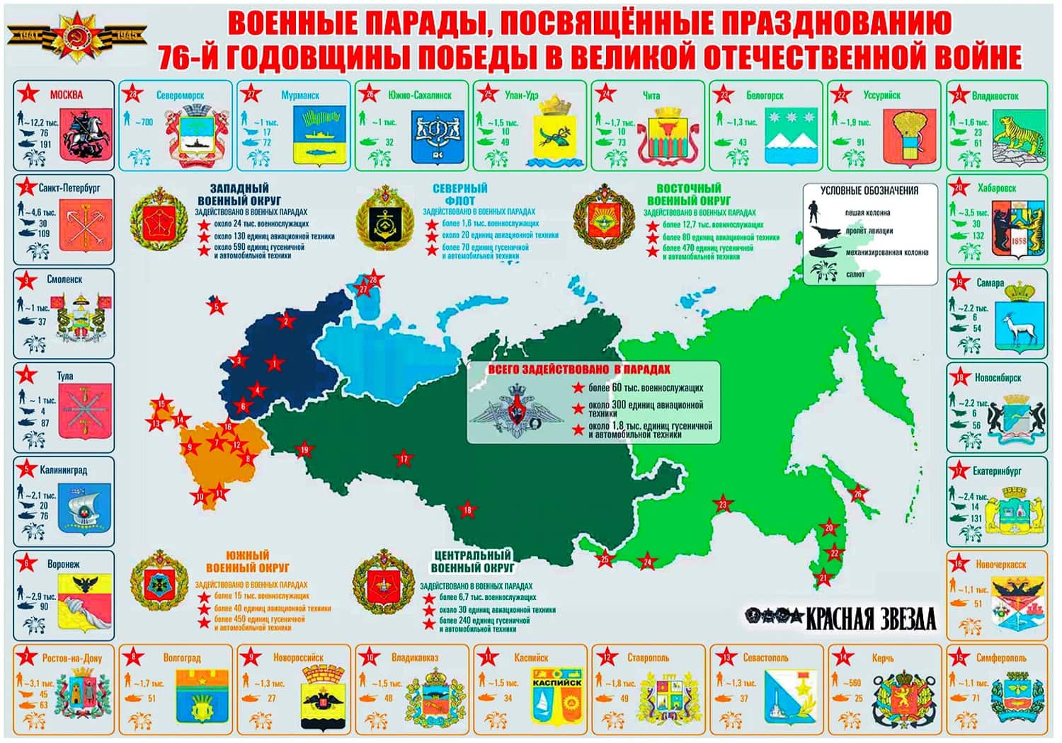 Sie setzten sich zusammen aus Offizieren, Unteroffizieren und Soldaten der diversen Streitkräfte-Garnisonen des größten Landes der Erde (siehe Grafik unten), Kadetten von Militäruniversitäten, Mitglieder der allrussischen Bewegung „Unarmia” sowie Vertreter von Militär-Strafverfolgungsbehörden und Kosakentruppen. Im den Ansprachen folgenden Defilé – ohne Masken – war erstmals in diesem Jahr die Militärpolizei aus dem Zentralen Militärbezirk vertreten. Rein weibliche Marschblöcke bildeten die Studentinnen der Militäruniversität, der Akademie der Raumfahrt- und Luftwaffentruppen, der Militärakademie für Kommunikation „Budjonny” sowie der Logistsik-Akademie.