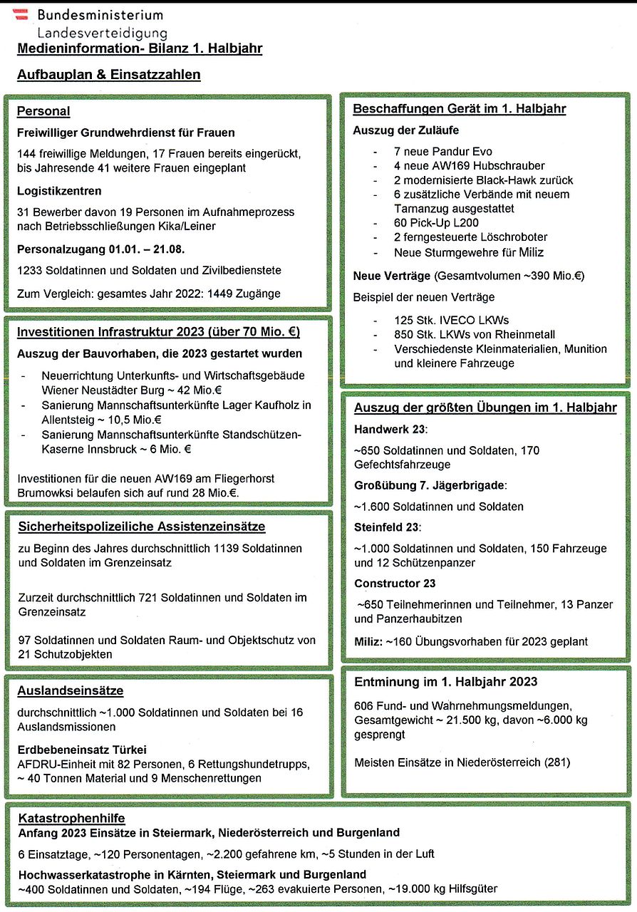 Am 23. August traten Verteidigungsministerin Klaudia Tanner und Generalstabschef Rudolf Striedinger vor die Presse, um durchaus detailreich und positiv auf das erste Halbjahr 2023 zurückzublicken.