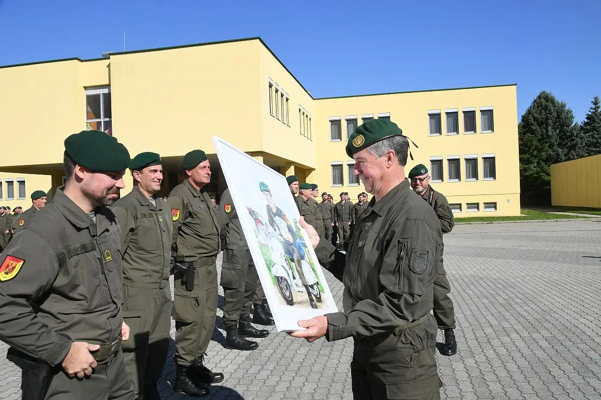 Was danach geschah, war „außerhalb des üblichen Protokolls”, wie der Moderator des Festaktes, Oberleutnant Dietmar Trinkl, schmunzelnd erläuterte. Vertreter der einzelnen Kompanien des JgBB traten hervor und überreichten ihrem scheidenden Kommandanten persönliche Präsente, welche dieser, emotional berührt, entgegennahm. Handschläge, Umarmungen. Emotion lag in der Luft. Ein Ausdruck von gegenseitiger Wertschätzung und Kameradschaft, Elemente, die den Kern des Bundesheeres bilden und gerade im Ernstfall, wo man sich blind auf den Mann oder die Frau neben einem verlassen können muss, unverlässlich sind.