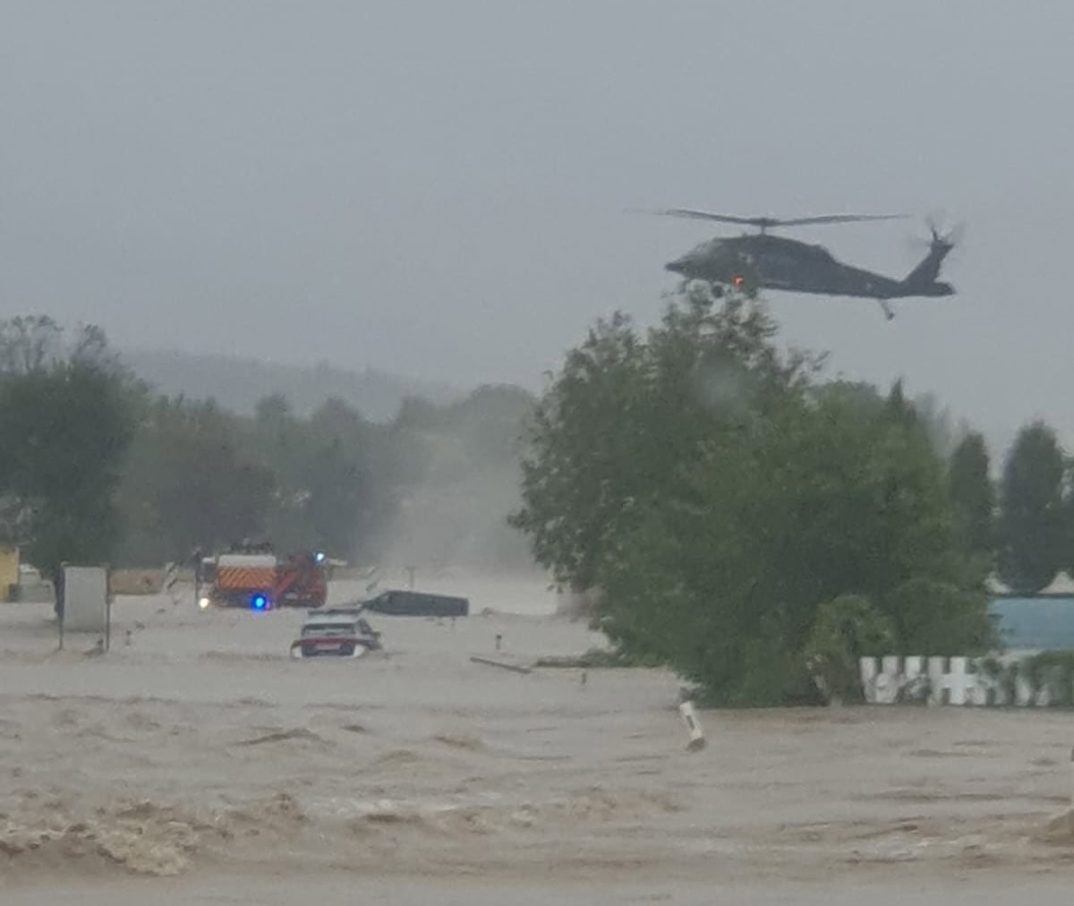 Der Black Hawk kam laut einer aktuellen Bundesheer-Aussendung „zu Hilfe, nachdem zwei zivile Einsatzkräfte, ein Polizist und ein Feuerwehrmann, im Hochwasser an der Unfallstelle festsaßen. Die beiden Einsatzkräfte konnten mittels Windenbergung durch den Hubschrauber erfolgreich gerettet werden.”