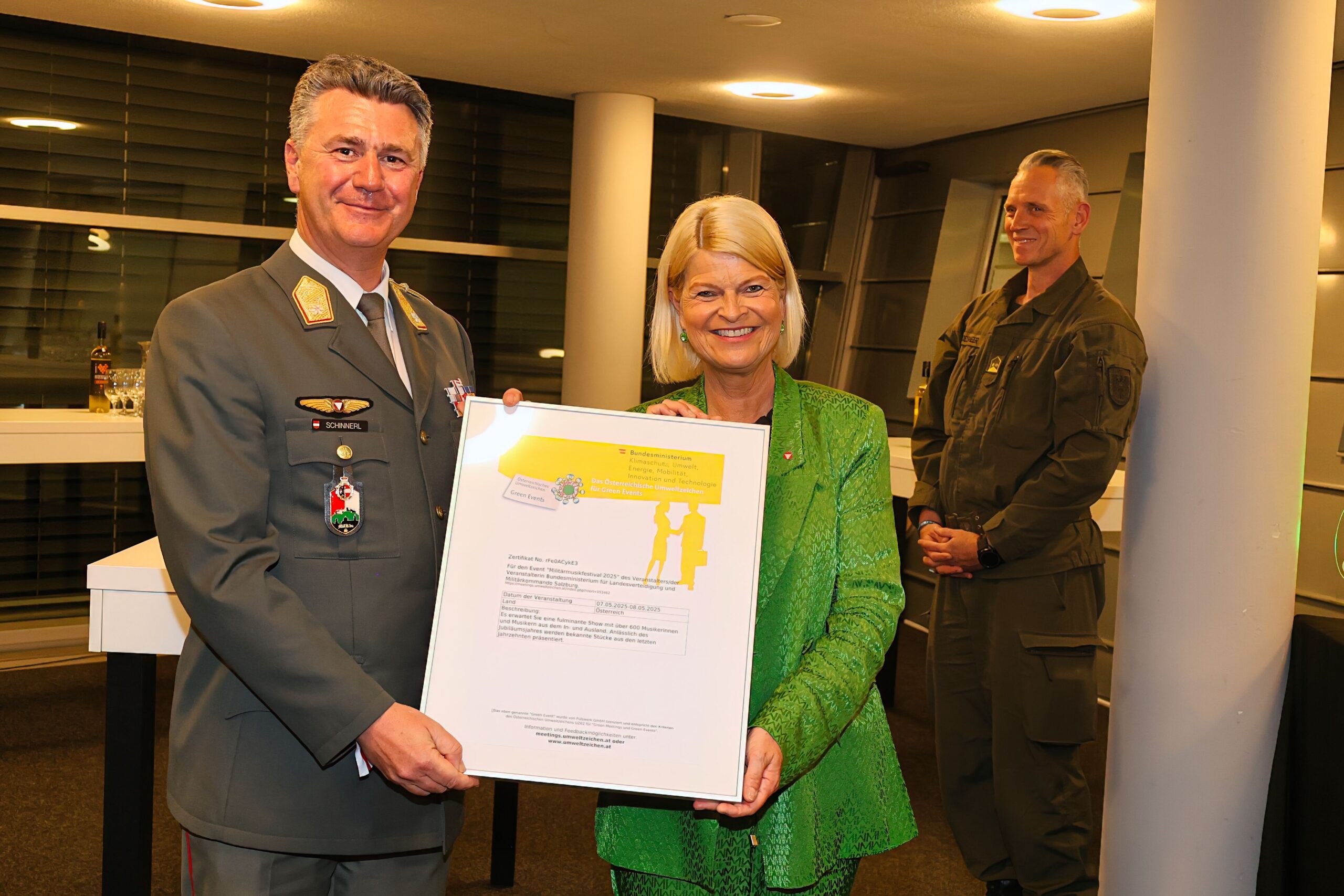 Das Militärkommando Salzburg wurde im Rahmen des Militärmusikfestivals für sein vorbildliches Engagement im Bereich der Nachhaltigkeit ausgezeichnet. Frau Bundesministerin überreichte die Zertifizierung „Green Event“ und würdigte damit die umfangreichen Bemühungen des Militärkommandos, das Festival umweltfreundlich und ressourcenschonend zu gestalten.