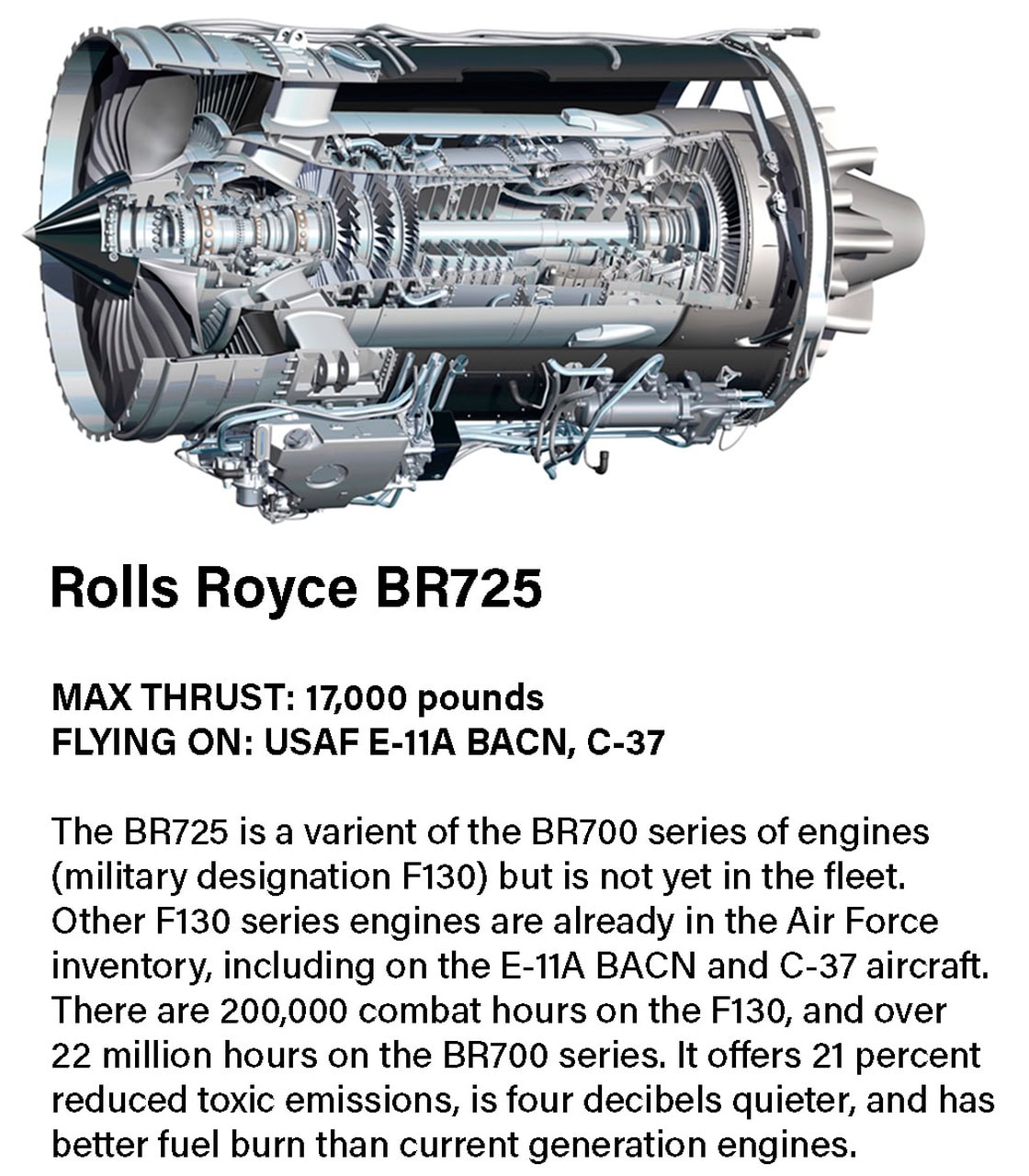 Laut den am 24. September in die täglichen Vertragsmitteilungen des Pentagons (die Informationen über alle Vergaben im Wert von knapp sieben Milliarden Euro enthält) aufgenommenen Angaben, sieht der Vertrag 608 kommerzielle Triebwerke der von großen Business-Jets bekannten Serie BR700 (Militärversion BR725 beziehungsweise F130) plus Ersatztriebwerke, zugehörige Unterstützungsausrüstung und kommerzielle technische Daten vor, die einschließlich Erhaltungsaktivitäten für die B-52H-Bomberflotte verwendet werden sollen. Das Volumen wird in den nächsten sechs Jahren auf rund 430 Millionen Eurogeschätzt, wird aber auf mehr als 2,2 Milliarden Euro anwachsen, wenn alle Optionen ausgeübt werden. Ort der Vertragserfüllung ist Indianapolis im US-Bundesstaat Indiana und die Arbeiten sollen voraussichtlich bis September 2038 abgeschlossen sein. Danach soll eine „substanzielle” Dienstzeit anschließen.