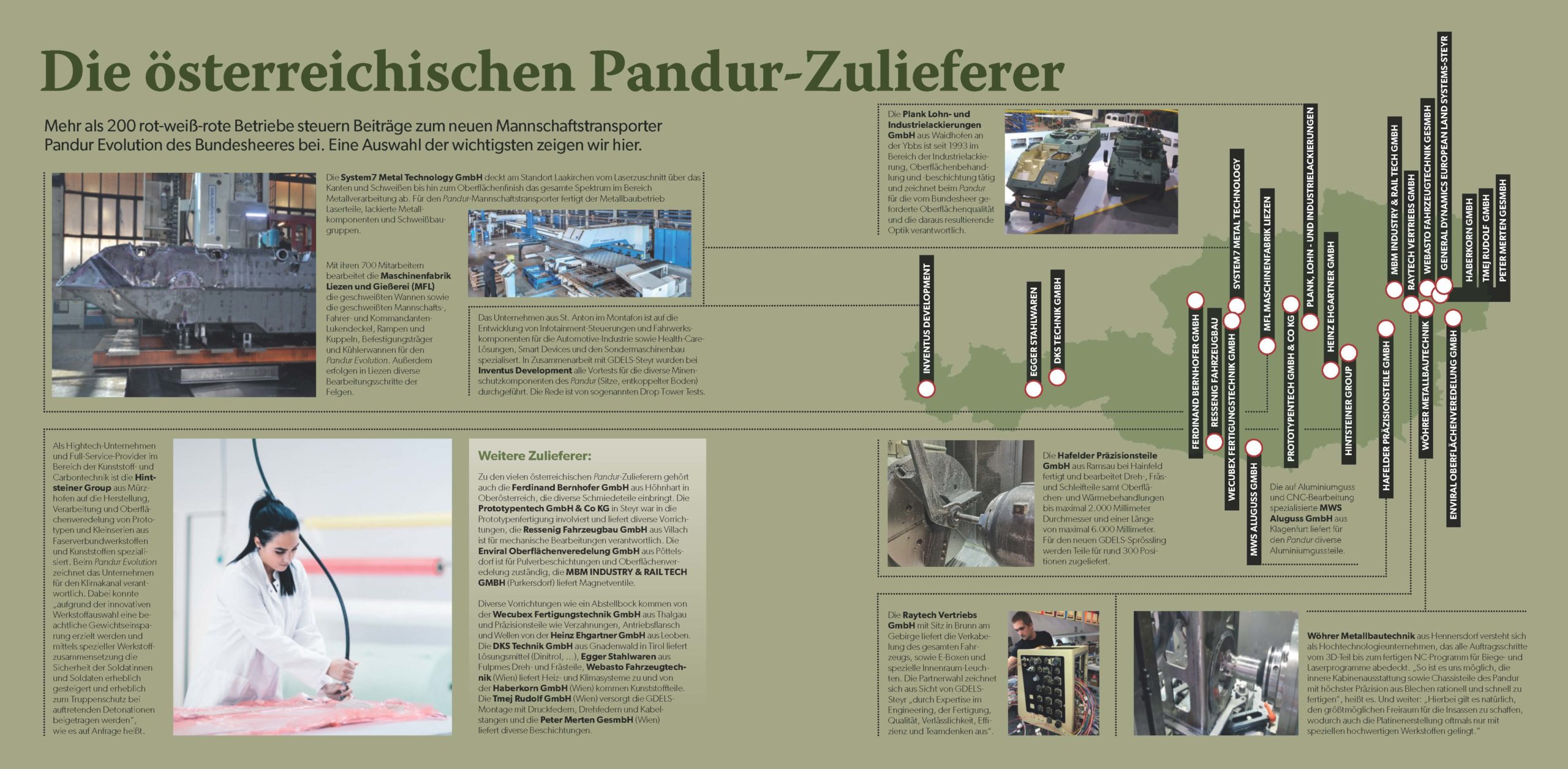 Das Besondere daran: Die Entwicklung des Fahrzeugs fand in Österreich statt, aber auch die Endproduktion und ein Großteil der Vorarbeiten passiert unter Einbeziehung zahlreicher Zulieferer hierzulande (siehe Grafik auf der nächsten Seite). Die Raytech Vertriebs GmbH aus Brunn am Gebirge steuert beispielsweise die Verkabelung des gesamten Fahrzeugs bei sowie E-Boxen und speziell für die Bedürfnisse des Bundesheeres entwickelte Innenraumleuchten. Die oberösterreichische System7 Metal Technology GmbH wiederum fertigt für den Pandur Laserteile, Metallkomponenten und Schweißbaugruppen. Die Vortests für die Minenschutzsitze wurden bei Inventus Development in Vorarlberg absolviert und die Maschinenfabrik Liezen und Gießerei (MFL) zeichnet unter anderem für die Bearbeitung der geschweißten Mannschafts-, Fahrer- und Kommandanten-Lukendeckel, Rampen, Kuppeln sowie Kühlerwannen und Befestigungsträger verantwortlich.