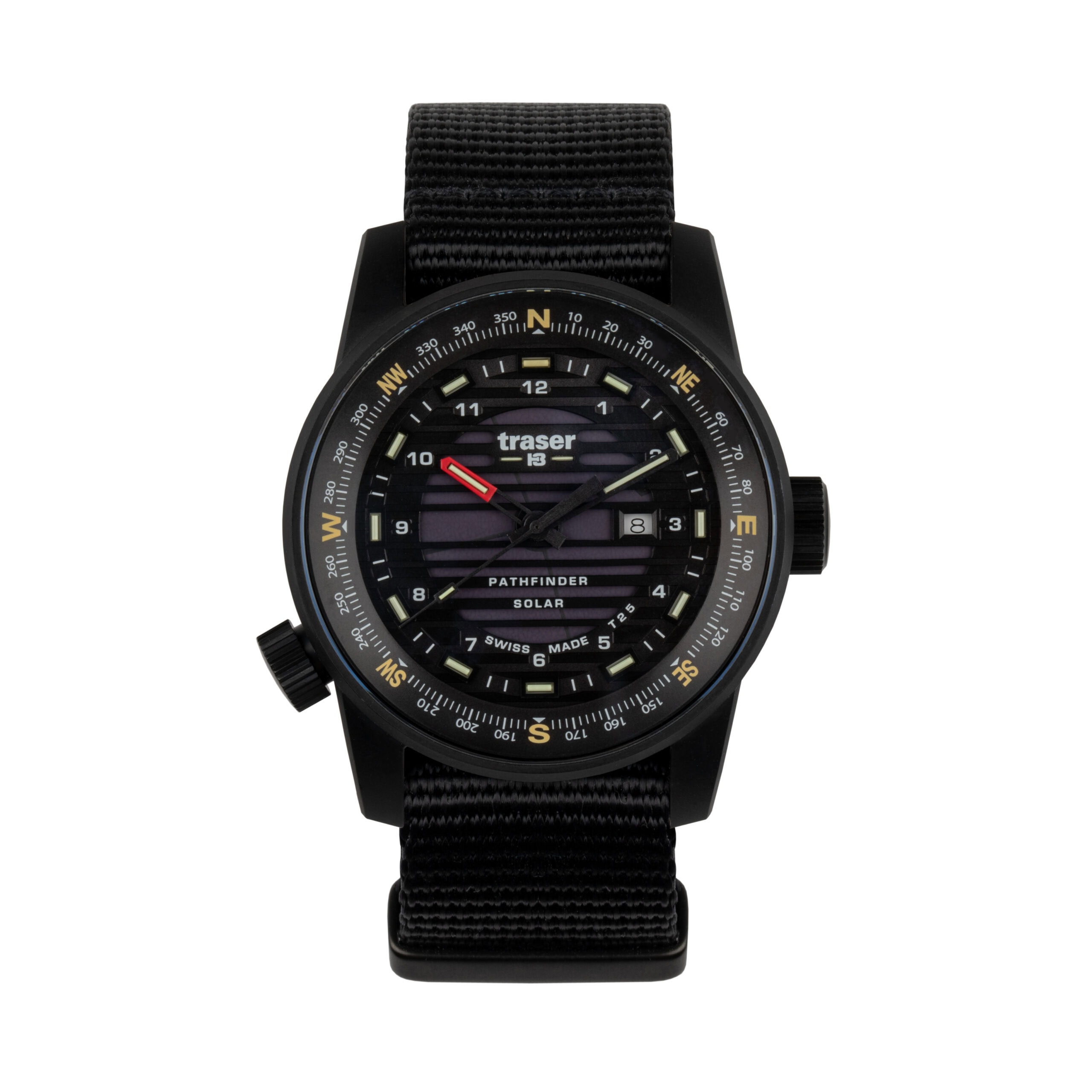 Eine weitere Besonderheit der neuen Uhr von Traser ist der verstellbare Kompassring. Wie bei anderen Modellen der P68 Pathfinder-Reihe ist auch beim Solar-Modell ein Ring, auf dem die Himmelsrichtungen eingezeichnet sind, verbaut. Mit einem Verstellrad auf der 8-Uhr-Position kann der Ring entsprechend der ermittelten Himmelsrichtung gedreht werden.