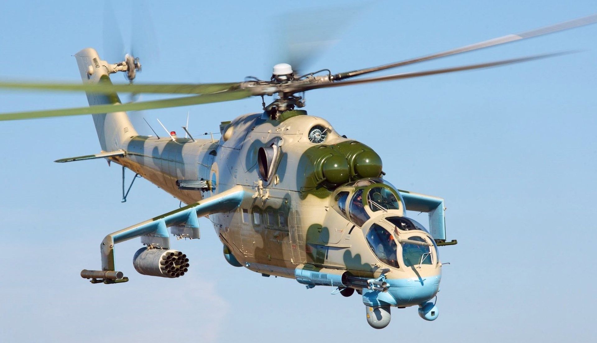 Kiew verfolgte seit 2008 auch eigene Upgrades für seine Hinds, als das Konotop Aircraft Repair Plant in Zusammenarbeit mit dem französischen Unternehmen SAGEM (das die ehrgeizigere zweite Stufe umsetzen würde) eine zweistufige Modernisierung entwickelte. Von da an produzierte die Konotop Aviakon-Fabrik die Version PU-1, zunächst durch Zerlegen und Renovieren von Hinds, die oft in sehr schlechtem Zustand aus der Lagerung genommen wurden. Jedes Upgrade dauerte vier Monate, endete mit drei Testflügen und kostete 25 Millionen Griwna (750.000 bis 1 Millionen Euro). Schließlich ist die PU-1 dank polnischer Helme mit PNL-3-Nachtsichtbrillen und überarbeiteter Cockpit-Beleuchtung auch nachts einsatzbereit. Ergänzt wird dies durch ein MAR-695-GPS-Navigationssystem und einen FPM-01KV-Lasermarkierer, der nachts als Zielansprache fungieren kann. Alle Modelle können (und tun dies normalerweise) B8V20-Raketenhülsen auf ihren Stummelflügeln montieren, die jeweils 20 S-8-Raketen tragen. Einige waren übrigens jahrelang (in weiß) mit den ukrainischen Blauhelmen im Kongo im Einsatz.